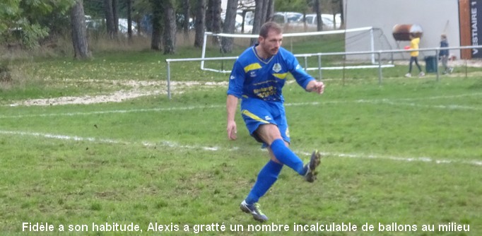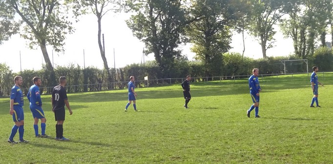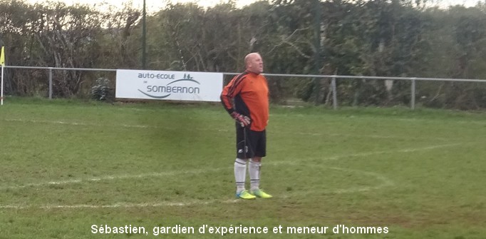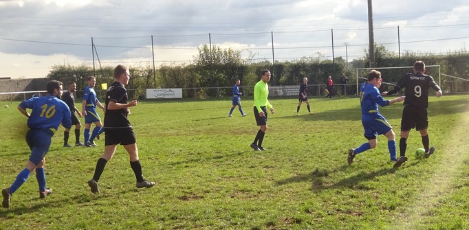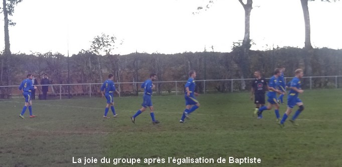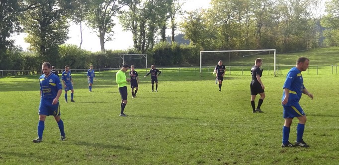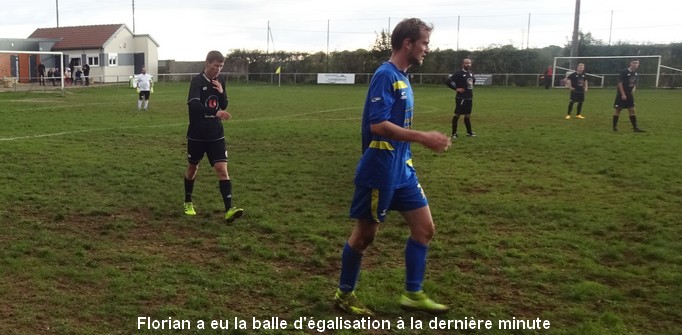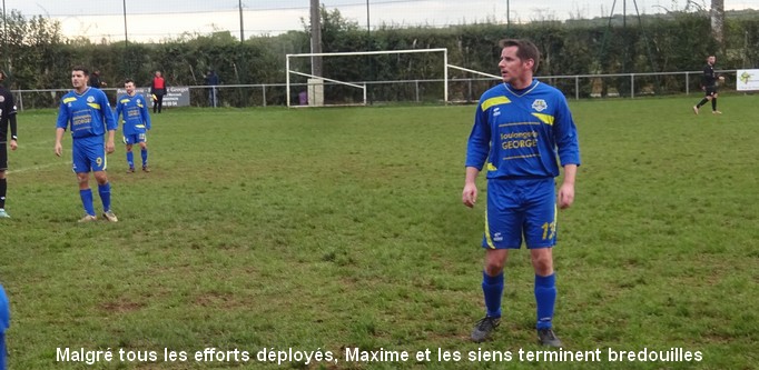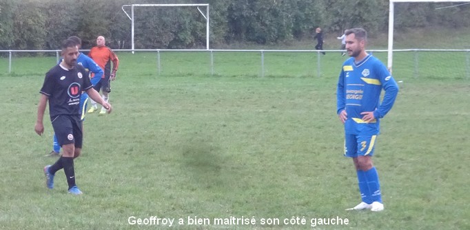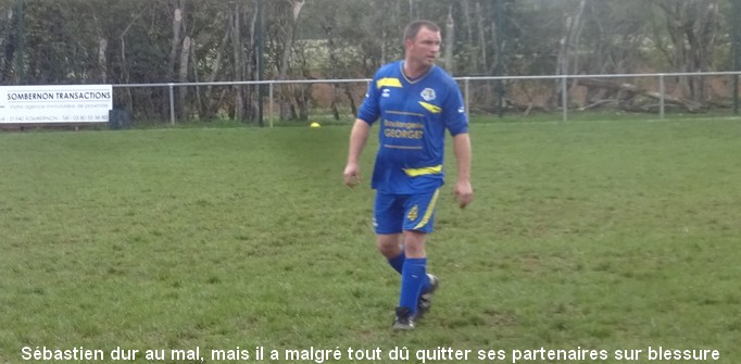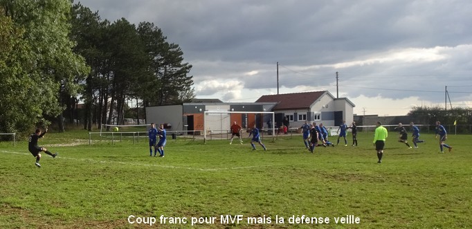On tourne autour du pot mais on y arrive pas….. Un match qui laisse une nouvelle fois des regrets ! Face au leader de la poule, le FCSG a fait mieux que se défendre mais les visiteurs ont fait parler le réalisme nécessaire pour occuper les premiers rôles. On assiste à une grosse bataille de milieu de terrain dans laquelle MVF montre une meilleure technique individuelle mais l’arrière garde tient bien la baraque à l’image de Geoffroy, solide sur son côté gauche. 0 à 0 à la pause malgré une belle frappe de Cédric qui flirte avec la transversale. Juste après le repos, MVF met le petit coup d’accélérateur qui fait la différence et inscrit deux buts dans les dix premières minutes. Ce scénario a le mérite de sèmer la révolte chez les bleus. Ce temps fort est mis à profit par Baptiste qui vient battre le gardien de près sur un bon service de Cédric. Ca pousse, ça pousse mais il faut un sauvetage à la Neuer de Sébastien pour continuer d’y croire. A la dernière minute du temps réglementaire, sur un coup franc du captain la tête de Florian trouve la base du poteau et le ballon revient…dans les bras du gardien. Un CSC anecdotique scelle le sort des bleus à la dernière seconde. Dommage !