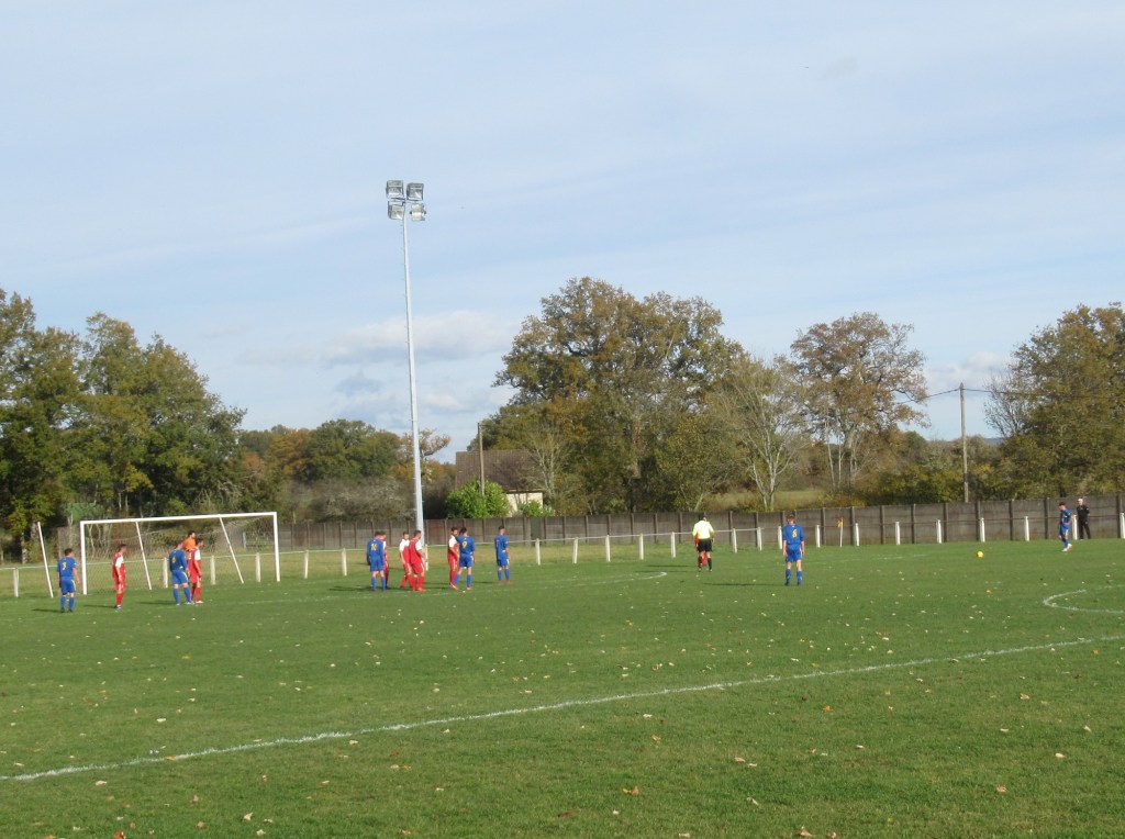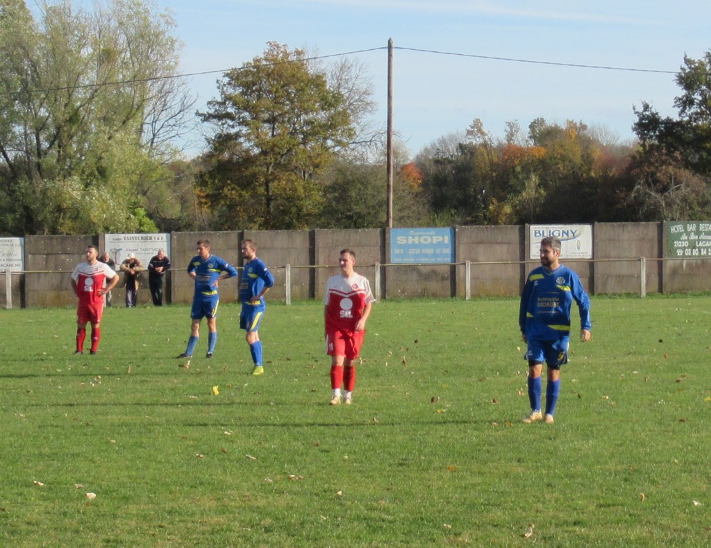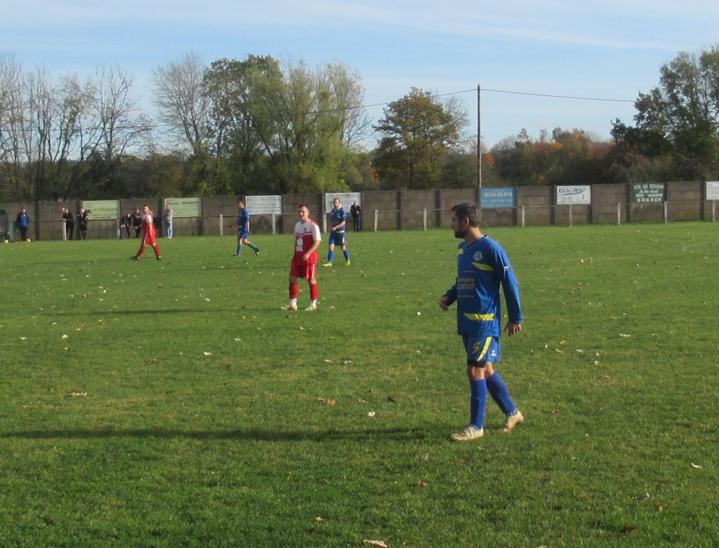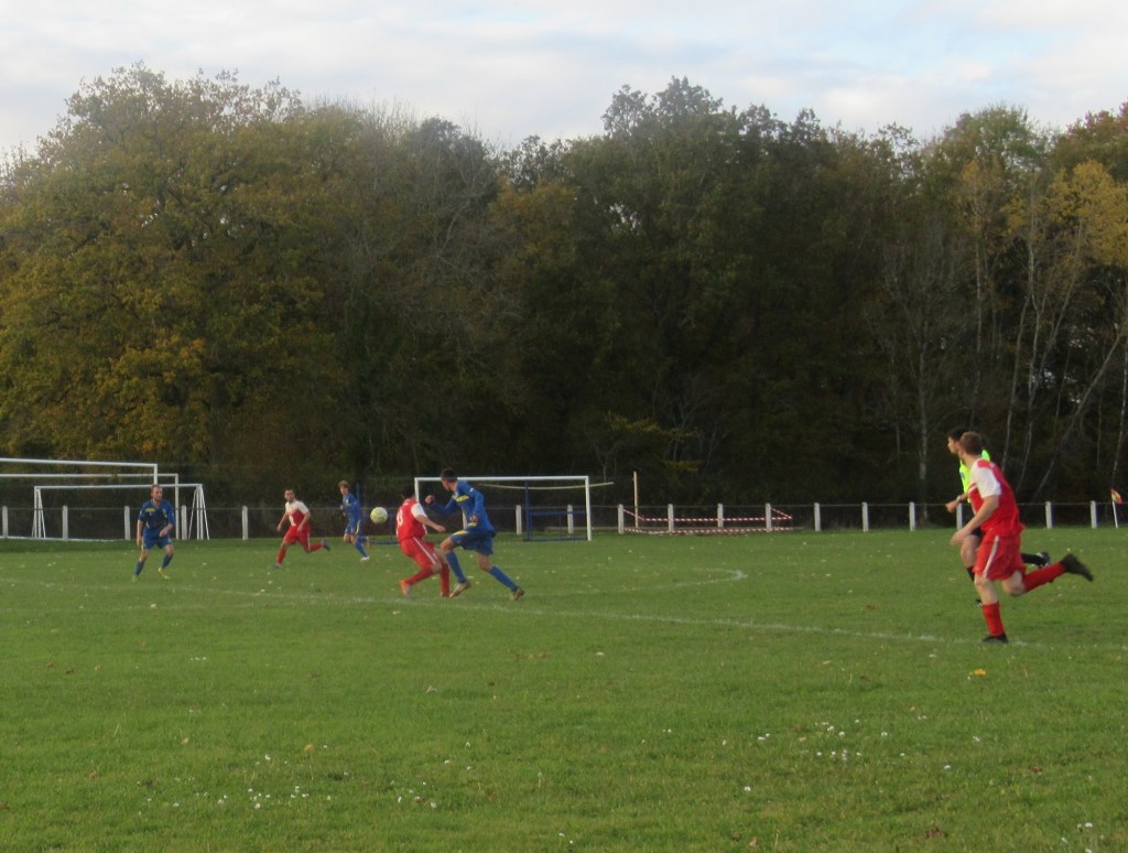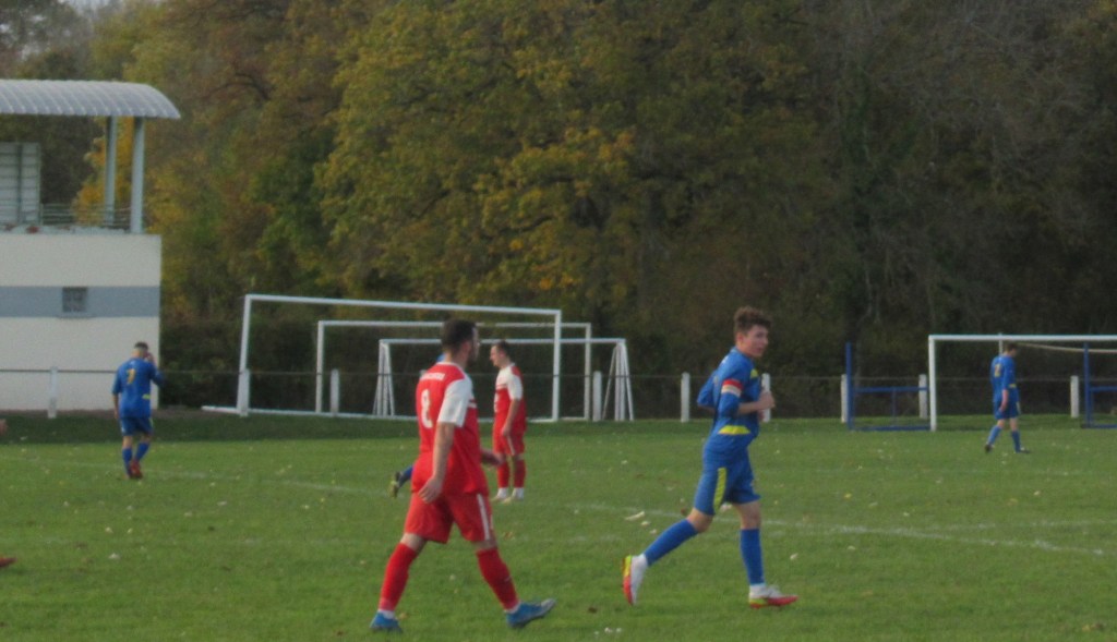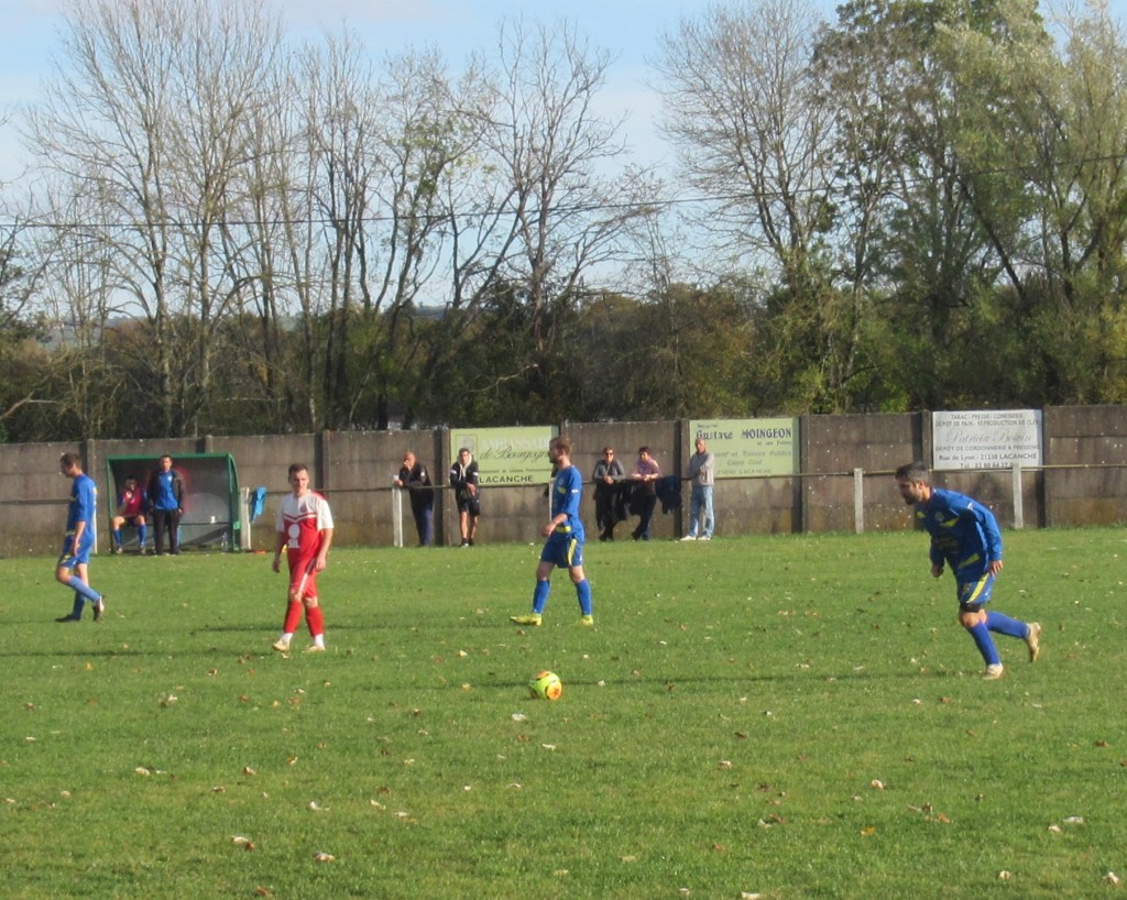 Est ce la faute au changement d’heure ??? En tous cas les bleus ratent complètement leur début de match et on assiste à une véritable attaque – défense. Et ce qui devait arriver arriva. Un centre de la droite trouve l’avant centre seul au six mètres qui marque d’une belle volée, 0-1. Puis 0-2 sur une tête imparable au deuxième poteau. A l’image d’un Antonin, très actif dans l’entre jeu, la révolte commence. Capitaine Basile, par sa vitesse, montre la voie. Peu avant la pause sa frappe de 20m est mal repoussée par le gardien et Clément, en vrai fennec des surfaces, réduit la marque, 1-2. Clément a même une balle de 2-2 mais son piqué manque de peu le cadre. En seconde période, avec le vent, Lacanche assoit sa qualification en marquant rapidement un troisième but. L’espoir renait même avec une nouvelle réalisation de Antonin à la conclusion d’un beau mouvement collectif. Mais Lacanche était le plus fort aujourd’hui et trouve encore par deux fois le chemin des filets. Le FCSG tente de placer quelques contres mais rien n’y fait.