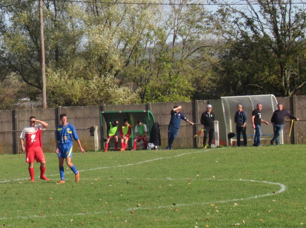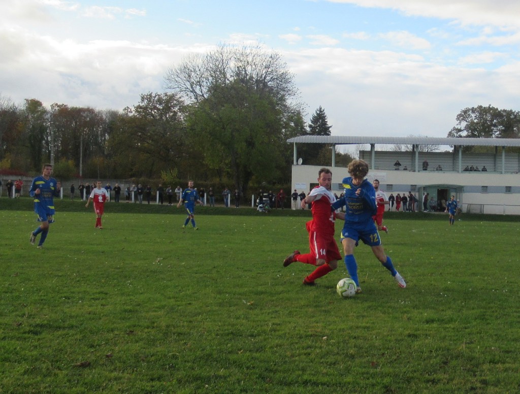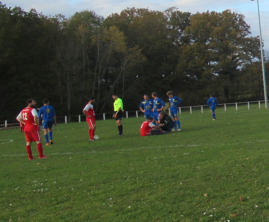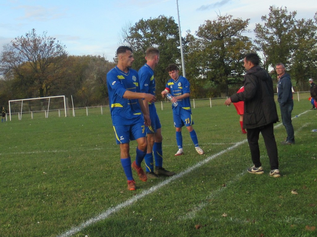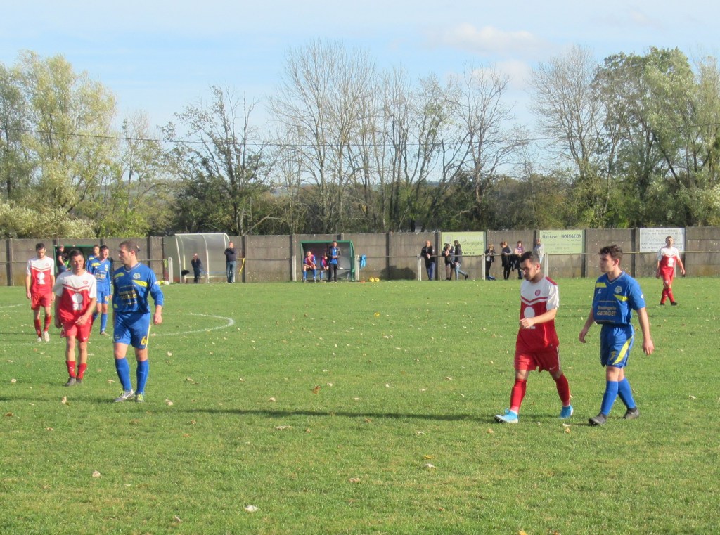 Est ce la faute au changement d’heure ??? En tous cas les bleus ratent complètement leur début de match et on assiste à une véritable attaque – défense. Et ce qui devait arriver arriva. Un centre de la droite trouve l’avant centre seul au six mètres qui marque d’une belle volée, 0-1. Puis 0-2 sur une tête imparable au deuxième poteau. A l’image d’un Antonin, très actif dans l’entre jeu, la révolte commence. Capitaine Basile, par sa vitesse, montre la voie. Peu avant la pause sa frappe de 20m est mal repoussée par le gardien et Clément, en vrai fennec des surfaces, réduit la marque, 1-2. Clément a même une balle de 2-2 mais son piqué manque de peu le cadre. En seconde période, avec le vent, Lacanche assoit sa qualification en marquant rapidement un troisième but. L’espoir renait même avec une nouvelle réalisation de Antonin à la conclusion d’un beau mouvement collectif. Mais Lacanche était le plus fort aujourd’hui et trouve encore par deux fois le chemin des filets. Le FCSG tente de placer quelques contres mais rien n’y fait.