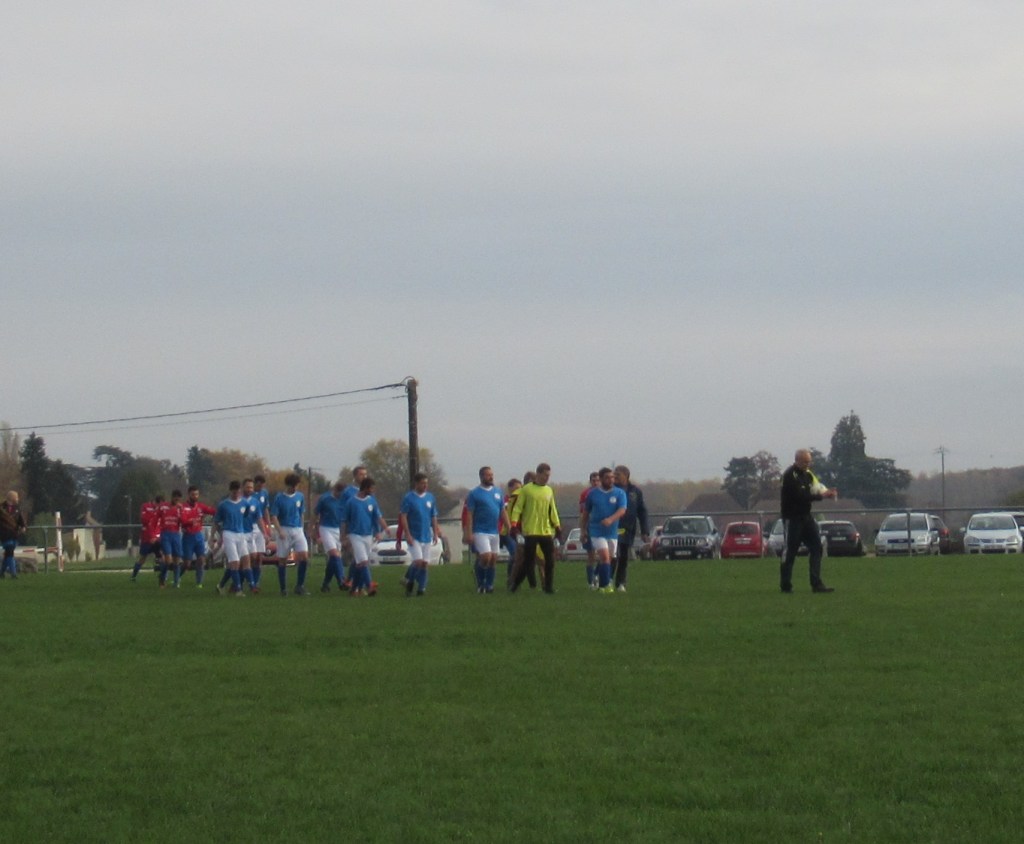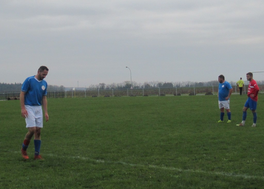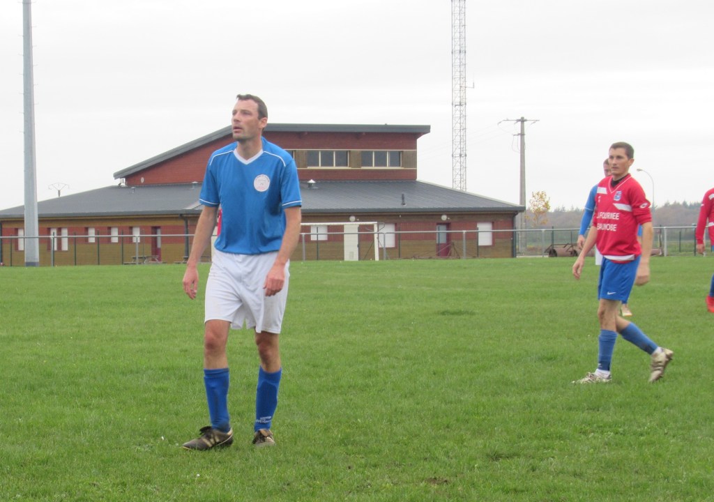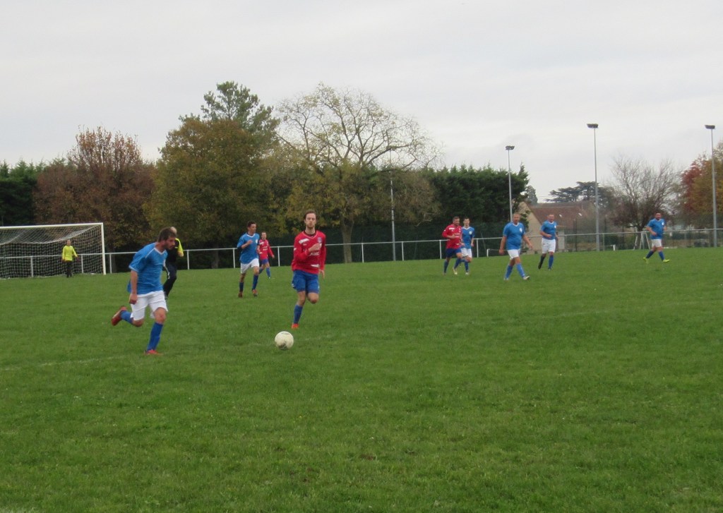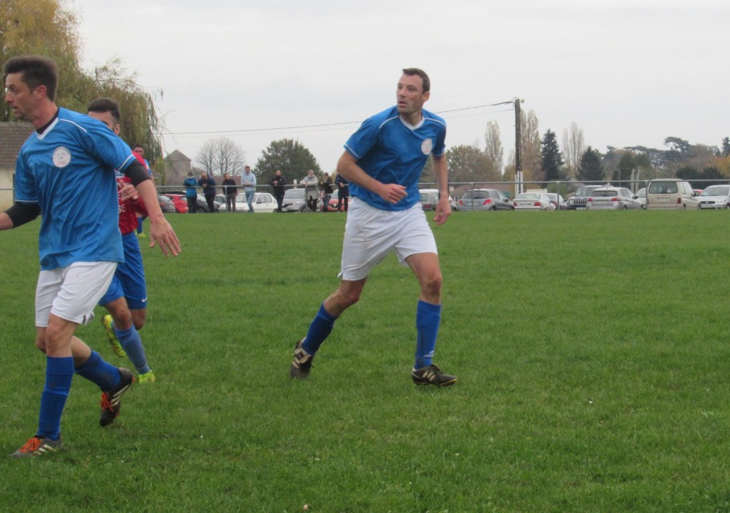 Le début de rencontre est plus que timide, mais pour leur première incursion dans le camp adverse, Elie mystifie trois défenseurs et marque d’une frappe croisée du gauche, 1-0. Mais pour ce début de match, c’est trop beau et les locaux profitent d’un cafouillage pour égaliser, 1-1. L’entrée en jeu de Renaud, qui apporte sa combativité et son agressivité dans le bon sens du terme, met ses coéquipiers sur les bons rails. Et Elie marque deux nouveaux buts, d’abord sur une service de Clément puis en profitant d’une erreur de la défense, 3-1 à la pause. En seconde période le FCSG met enfin la main sur le ballon et les occasions se multiplient par Elie encore et Thomas. Mais une frappe improbable des locaux vient se loger sous la latte et le match est relancé, 3-2. Mais les bleus emmenés par un Clément omniprésent dans l’entre jeu vont asseoir leur succès. Jordan dans un premier temps récupère un ballon mal dégagé pour marquer de près, 4-3. Bien servi sur un coup franc d’Alexis, Elie marque son quatrième but personnel qu’il dédiera à Michel Renault, affaibli par la maladie, son formateur en équipe de jeunes.