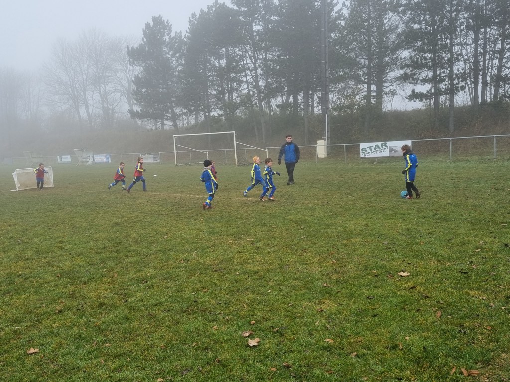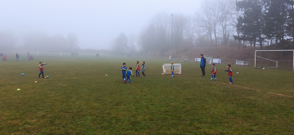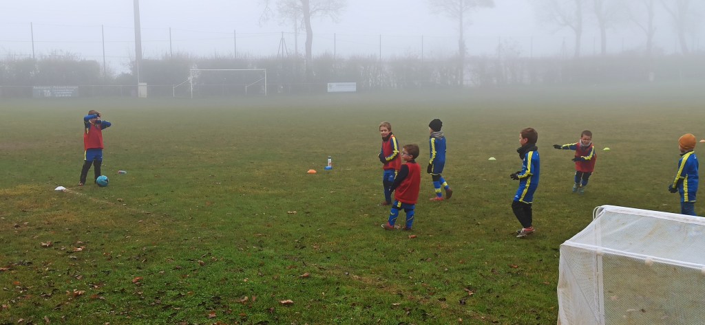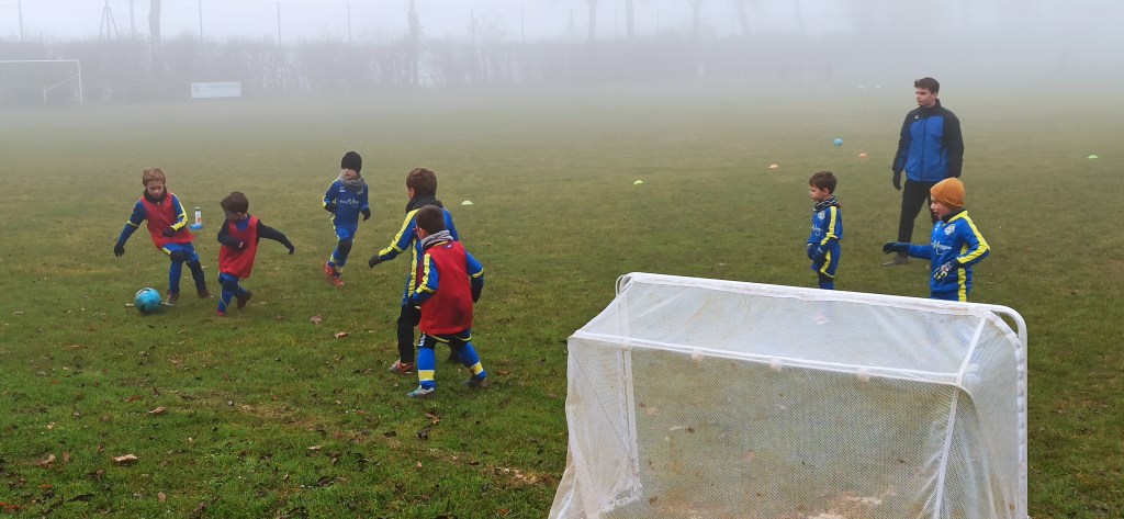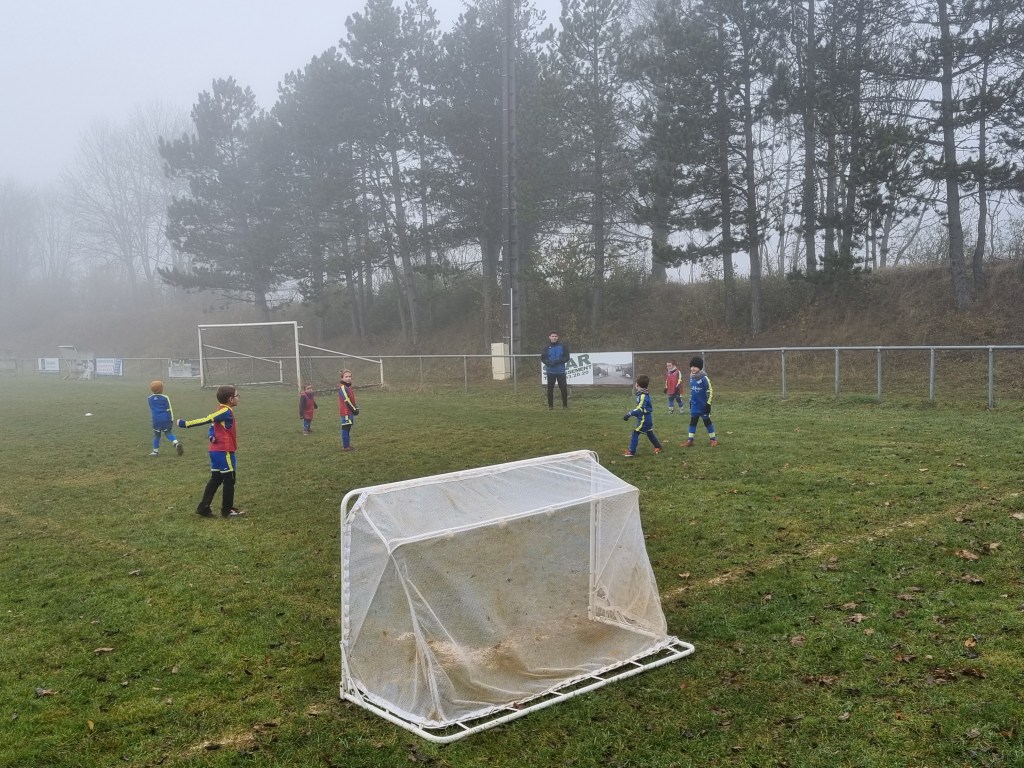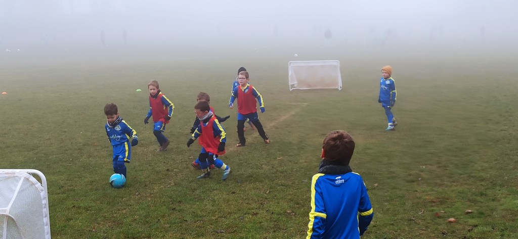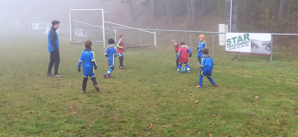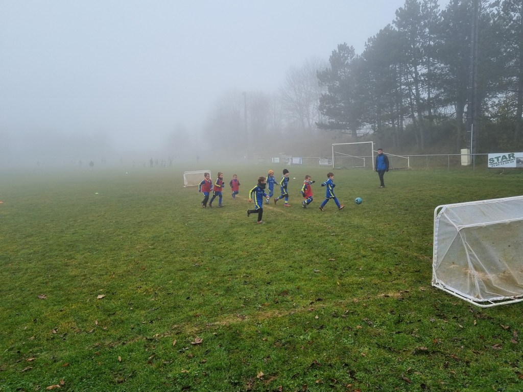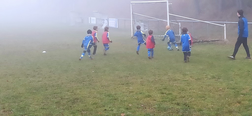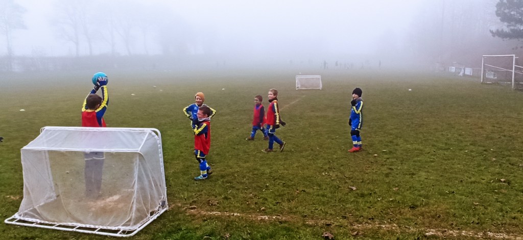 Opposition interne en U7 puisque notre adversaire du jour pour cet inter clubs ne présentait pas d’équipe U7. C’est néanmoin l’occasion de faire des matchs, le meilleur moyen de progresser. Et comme les grands, quelques soient les conditions (en l’occurrence le brouillard), on joue !