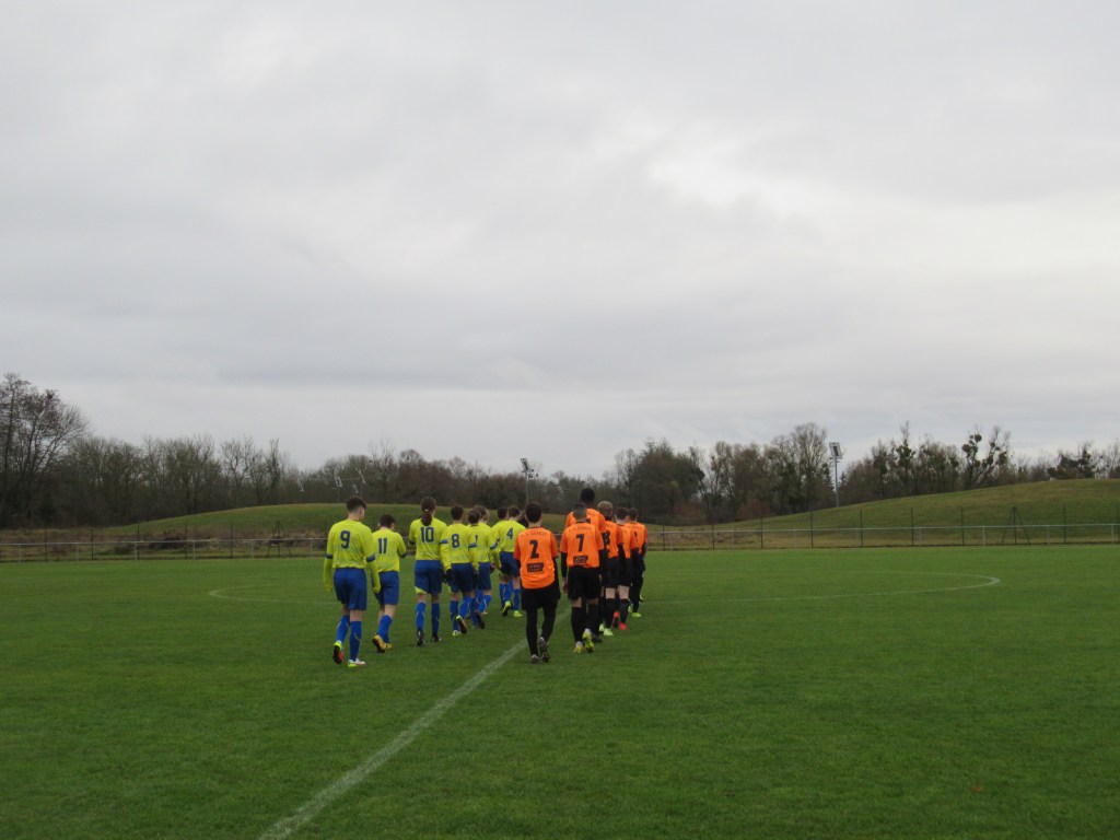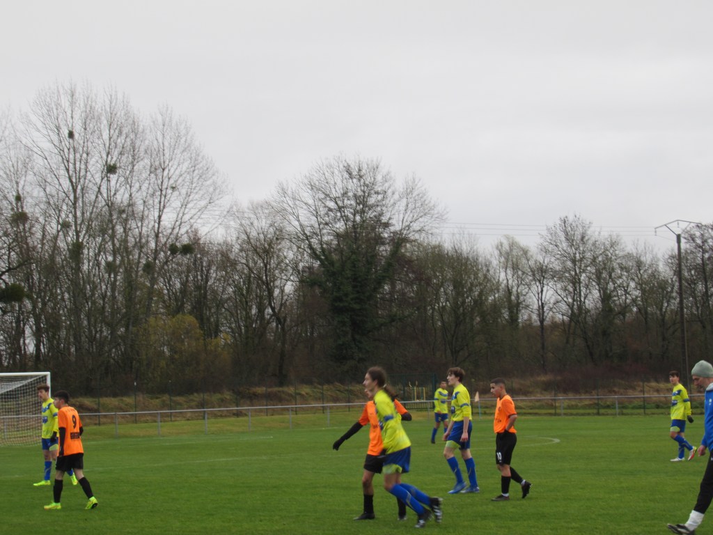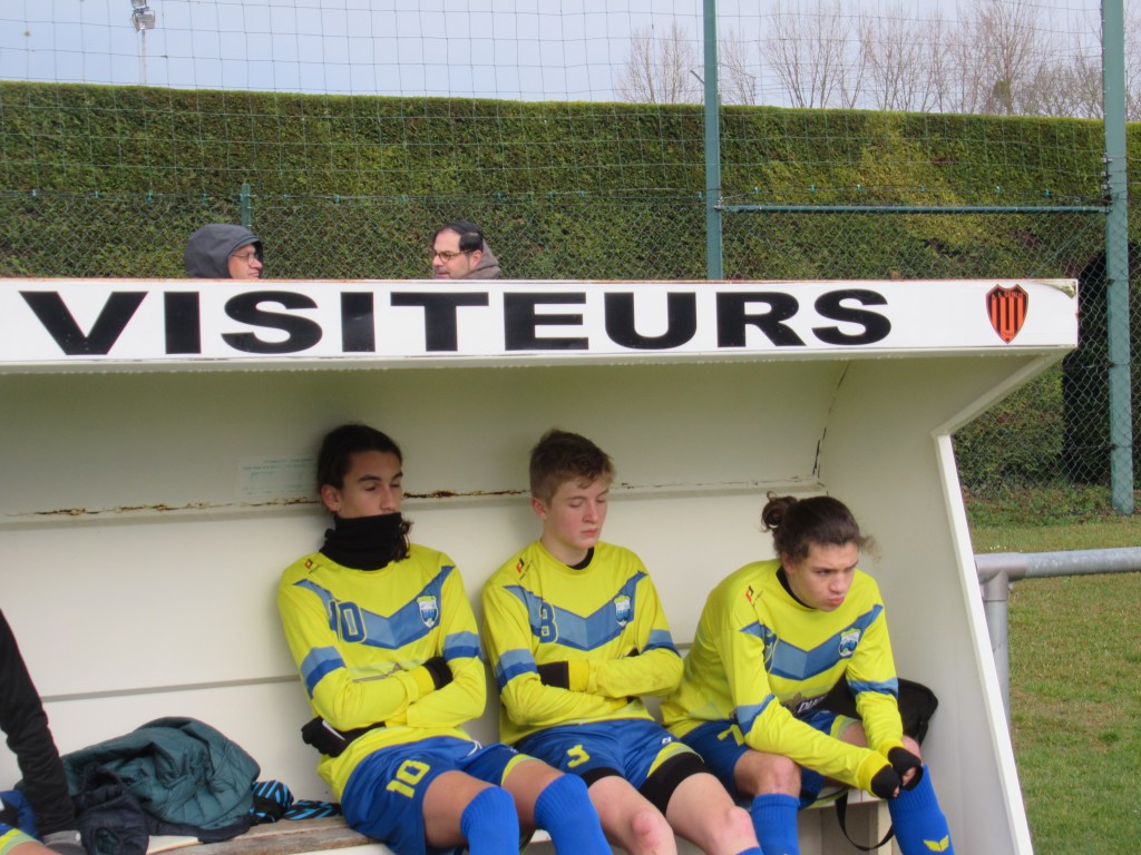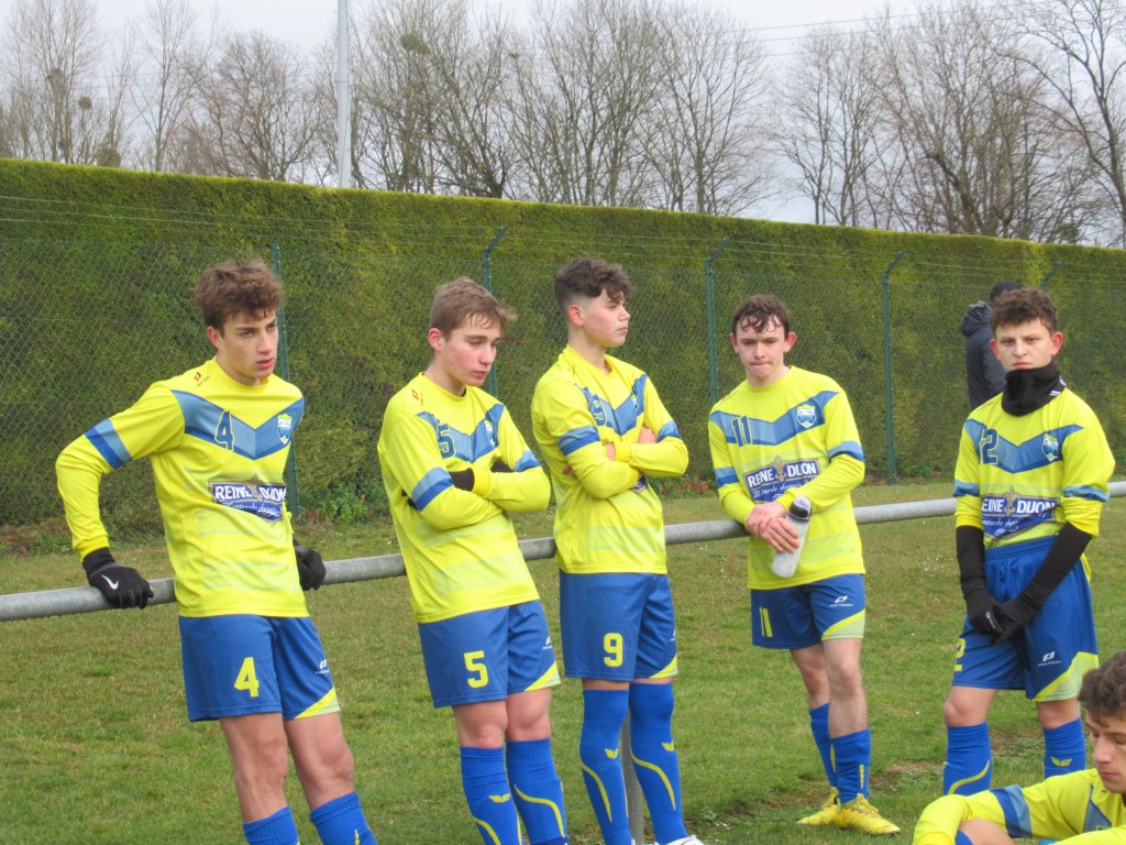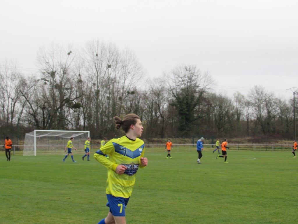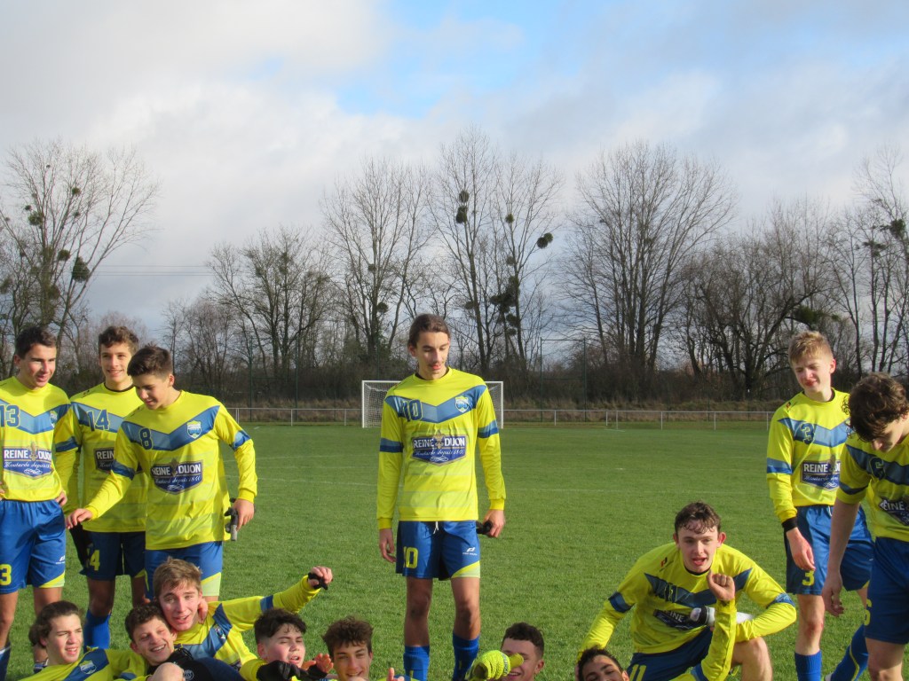 Dans un match terrible de suspense et d’incertitude, les deux équipes se sont séparées sur un score de parité logique, 1 à 1. Chaque équipe a eu sa mi-temps. Les locaux la première. Leur jeu de passes leur assure la main mise sur le match. Ca défend bec et ongle pour ne pas rompre. Mais sur une belle attaque placée, l’avant centre de Genlis trouve la lucarne sur un bon centre de la gauche, 0-1. On subit. Il faut une superbe claquette de Pierrot pour éviter un deuxième but. Les jaunes sortent progressivement le bout du nez, mais il manque de la justesse technique dans le dernier geste pour être dangereux. On défend bien et même si on est dominé on concède peu d’occasions. Après le repos, nos protégés démarrent timidement et un tacle non maîtrisé de Flavio au bout de cinq minutes offre un pénalty et une balle de break à Genlis. Le bruit de la frappe sur la transversale réveillent nos comparses et on assiste à partir de cet instant à un tout autre match. Les mouches ont changé d’ânes. L’activité de Pierre dan l’entre jeu fait un bien fou. On tient le ballon et on combine. Thomas Gallay s’offre trois balle d’égalisation…en vain. C’est ensuite une superbe volée de Simon qui échoue sur la barre. On pousse de plus belle. Simon va au pressing sur une relance adverse, chipe le ballon et centre pour qui ne manque pas l’offrande, 1-1. Le quatuor de derrière Gabin-Flavio,Gaby-Mehdi est monstrueux d’abnégation et de concentration. On est tout prêt de conclure mais il manque toujours un petit zeste de réussite, comme quand Martin tergiverse dans la surface. Genlis n’est pas en reste et veut ce match qu’une phénoménale intervention de Pierrot les privera. Un partage des points logique dans un match de très haut niveau disputé par les deux équipes dans un excellent état d’esprit. D2 nous voilà… Enfin !
