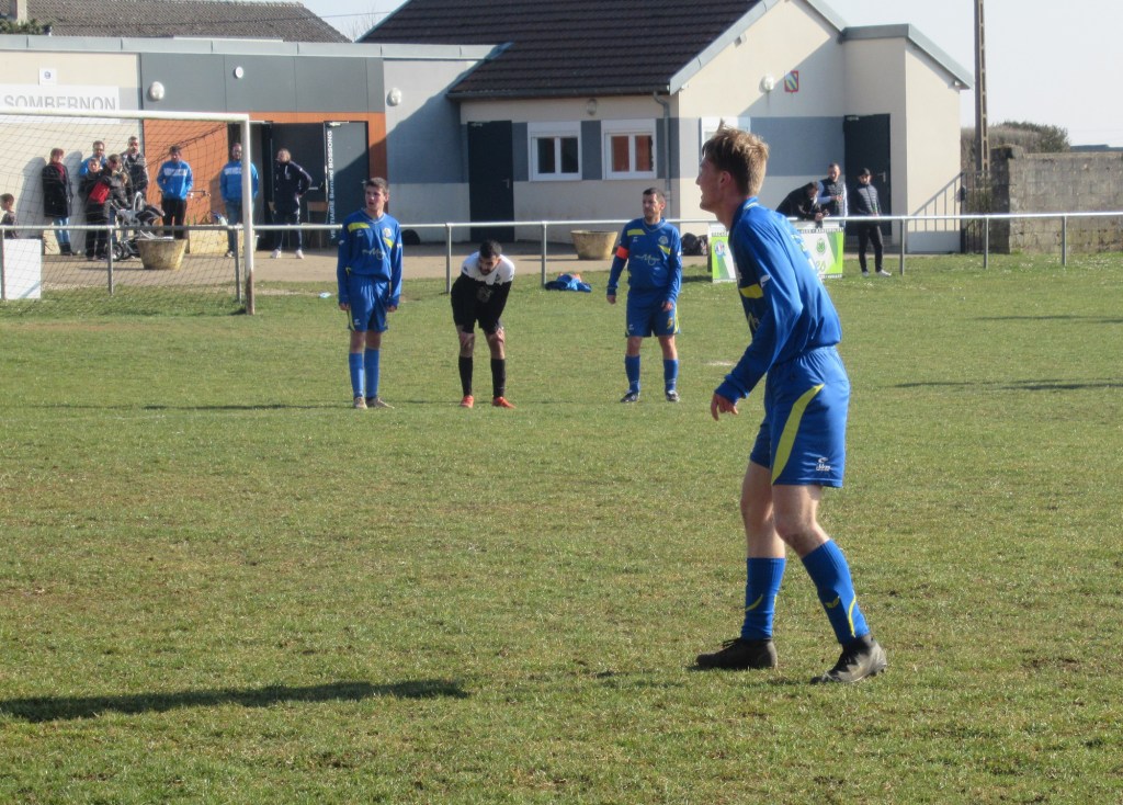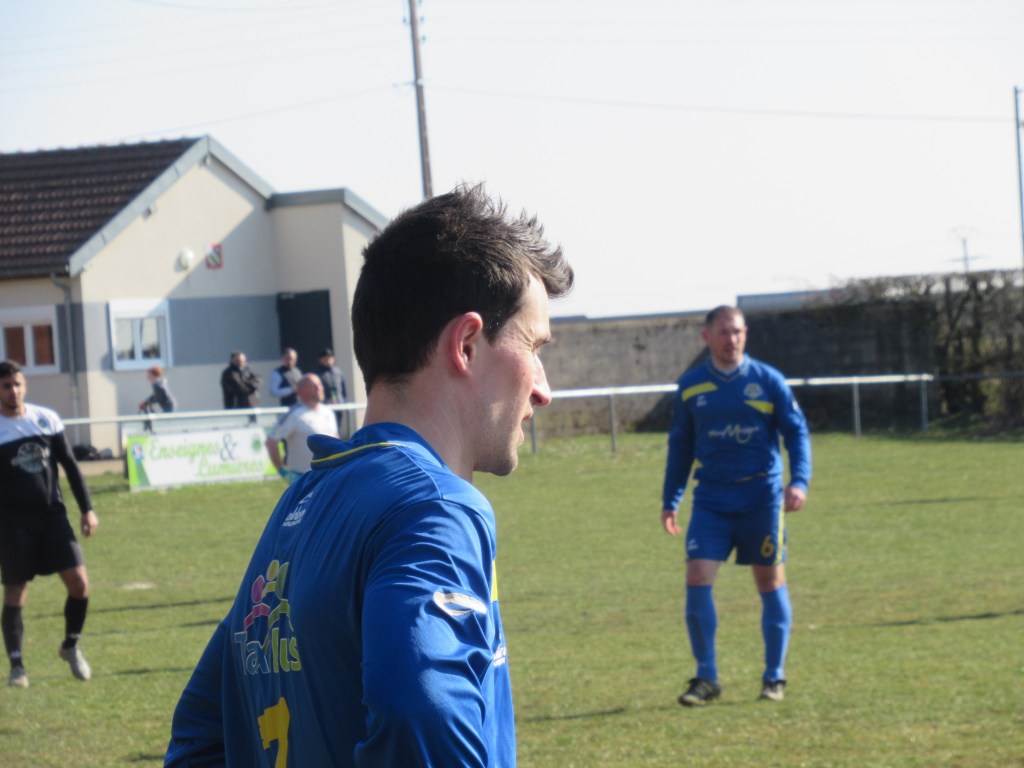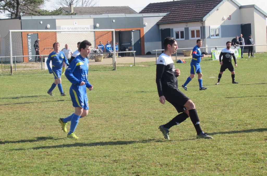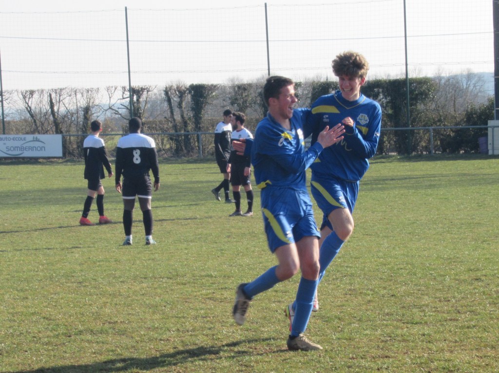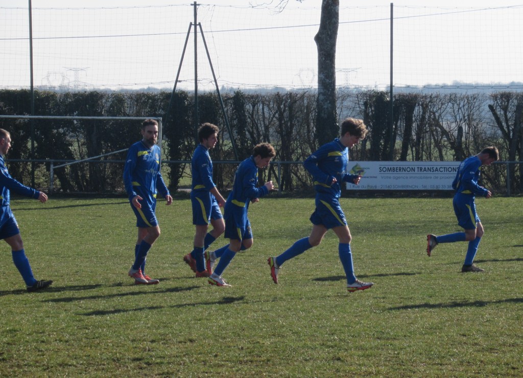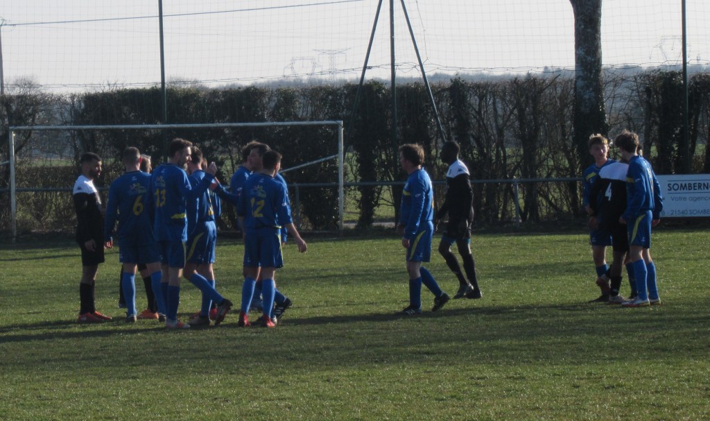 Le FC Sombernon-Gissey confirme ses belles prestations face aux grosses cylindrées. C’est un superbe succès que se sont offert les partenaires de cap’tain Cyril. La réserve de Longvic, troisième du groupe, impose son rythme en début de match avec une équipe très athlétique. Les bleus ont ensuite une très belle opportunité mais la frappe d’Olivier heurte la base du poteau. Les visiteurs ne sont pas en reste, mais un Sébastien Barthézien réussit deux très belles parades coup sur coup. Ca bataille dur au milieu. Les récupérateurs sont omni présents sous l’impulsion du duo Antonin-Alexis. 0 à 0 à la pause. La seconde période débute par un coup de théatre. Sur un coup franc plein axe, le gardien se troue sous la pression de Clément qui regarde le cuir échouer quelques centimètres derrière la ligne, 1 à 0. La pression adverse s’intensifie. Mais bis répétita quelques minutes plus tard. Le gardien relâche une balle et Clément en embuscade d’une tête plongeante rageuse au ras du poteau double la marque, 2-0. Les bleus défendent cette avantage becs et ongles à l’image de Sébastien impérial dans les airs. On est même tout près du 3-0 mais Elie n’assure pas sa frappe de près. Longvic presse, presse, presse encore mais rien n’y fait. Le FCSG engrange un succès très important dans l’opération maintien.