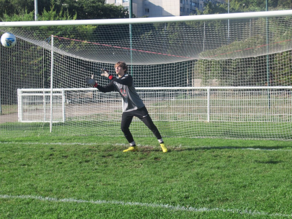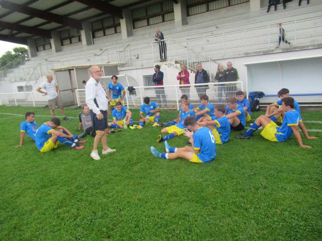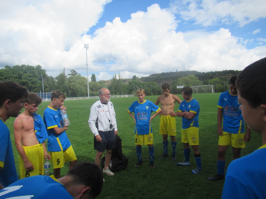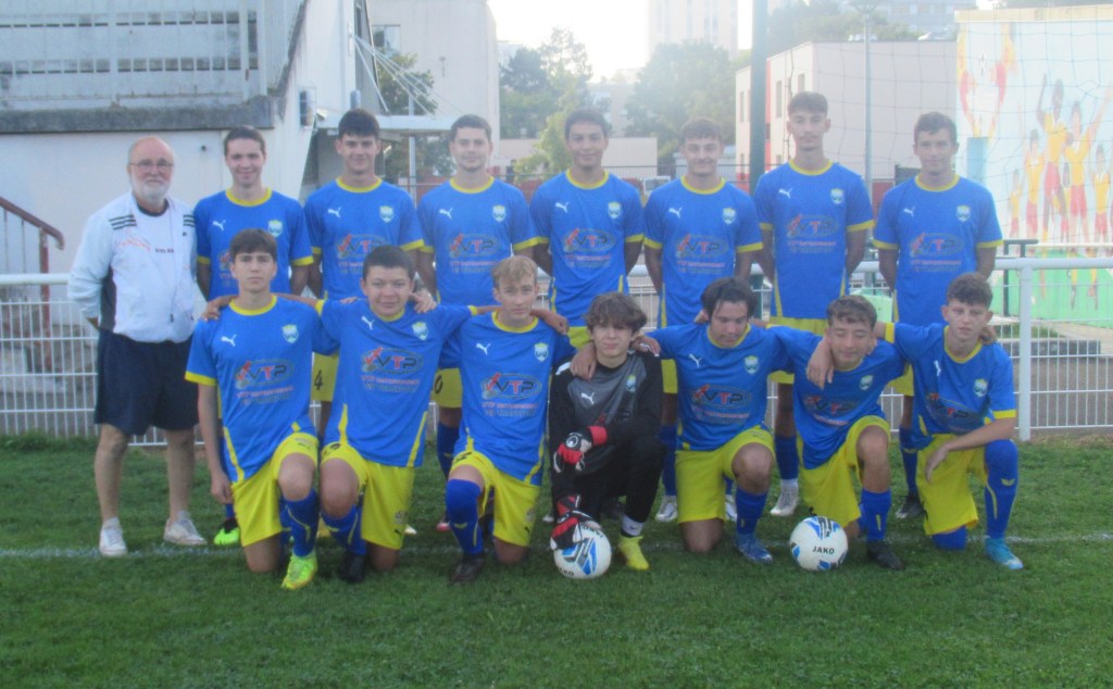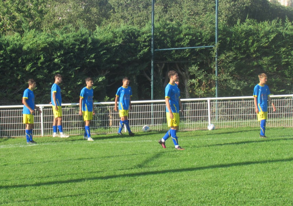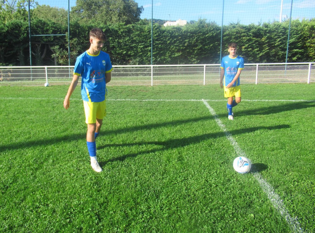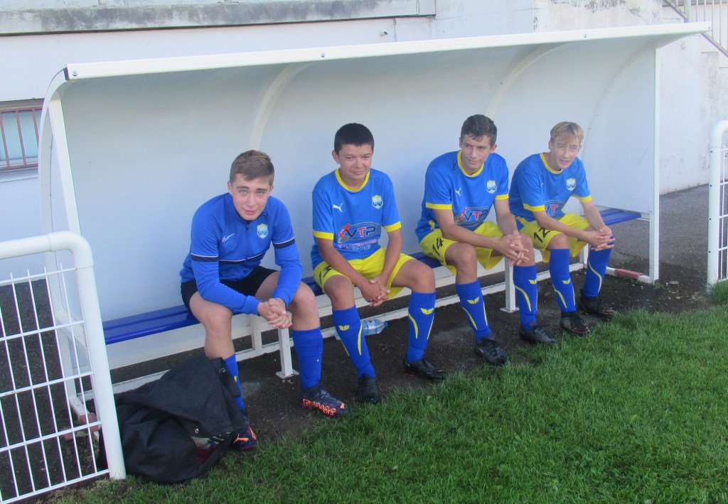 Face à une athlétique formation de l’ASFO (qui évoluait la saison dernière en R3), nos jeunes ont du se dépouiller pour tenir le coup. Bien que dominés, ce n’est qu’à la 35ème qu’ils ont concédé l’ouverture du score. Les visiteurs, maîtres de leur sujet, ajouteront un deuxième but avant la pause. Néanmoins les bleus avaient réussi à se montrer dangereux par Thomas et Simon. Après le repos, l’intensité va baisser d’un cran, des deux côtés. Suite à un bon pressing, Clément récupère et donne à Hugo F qui marque d’une frappe sèche de 20m. Les locaux se redonnent de l’air sur un but casquette suite à une mauvaise relance entre Louison et Noé. Un solo de l’ailier droit d’ASFO scelle définitivement la rencontre, 4 à 1. Il faut toutefois saluer la prestation de l’équipe entière qui a su faire preuve d’une solidarité exceptionnelle pour tenir le choc. Ils n’ont pas compté leurs efforts et peuvent sortir grandis de cette rencontre qui doit servir pour l’avenir. A confirmer !