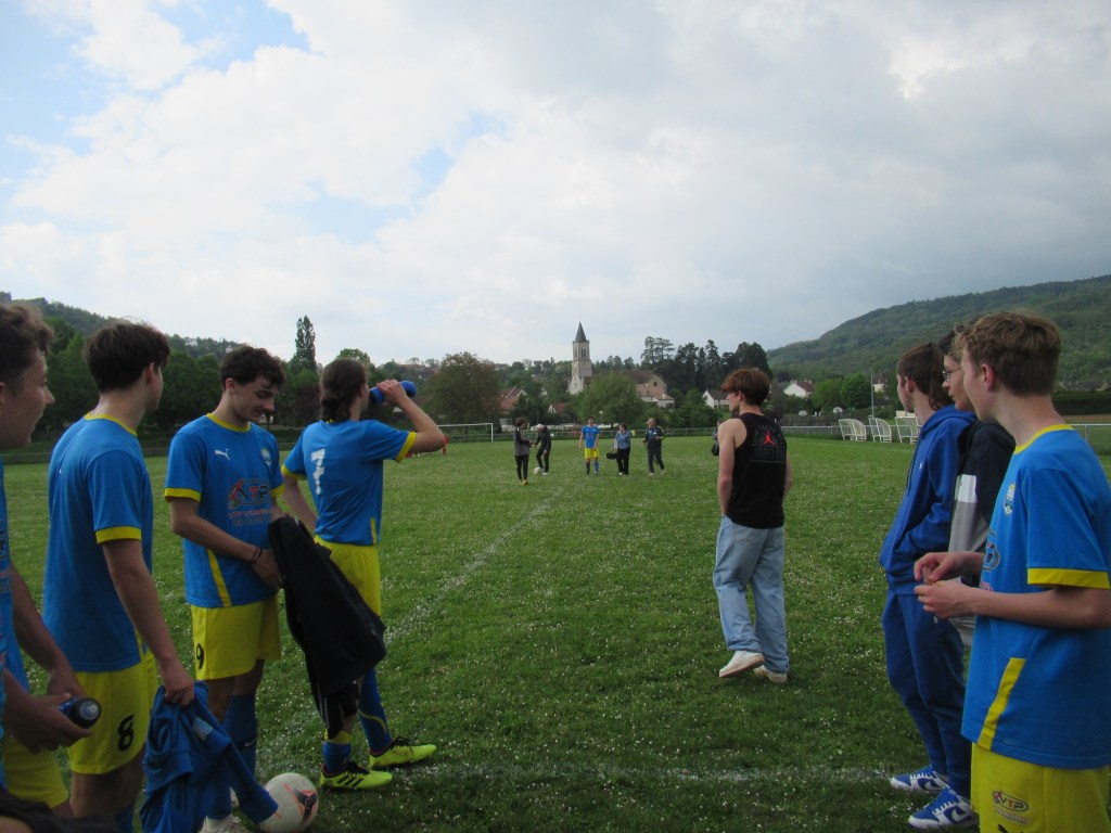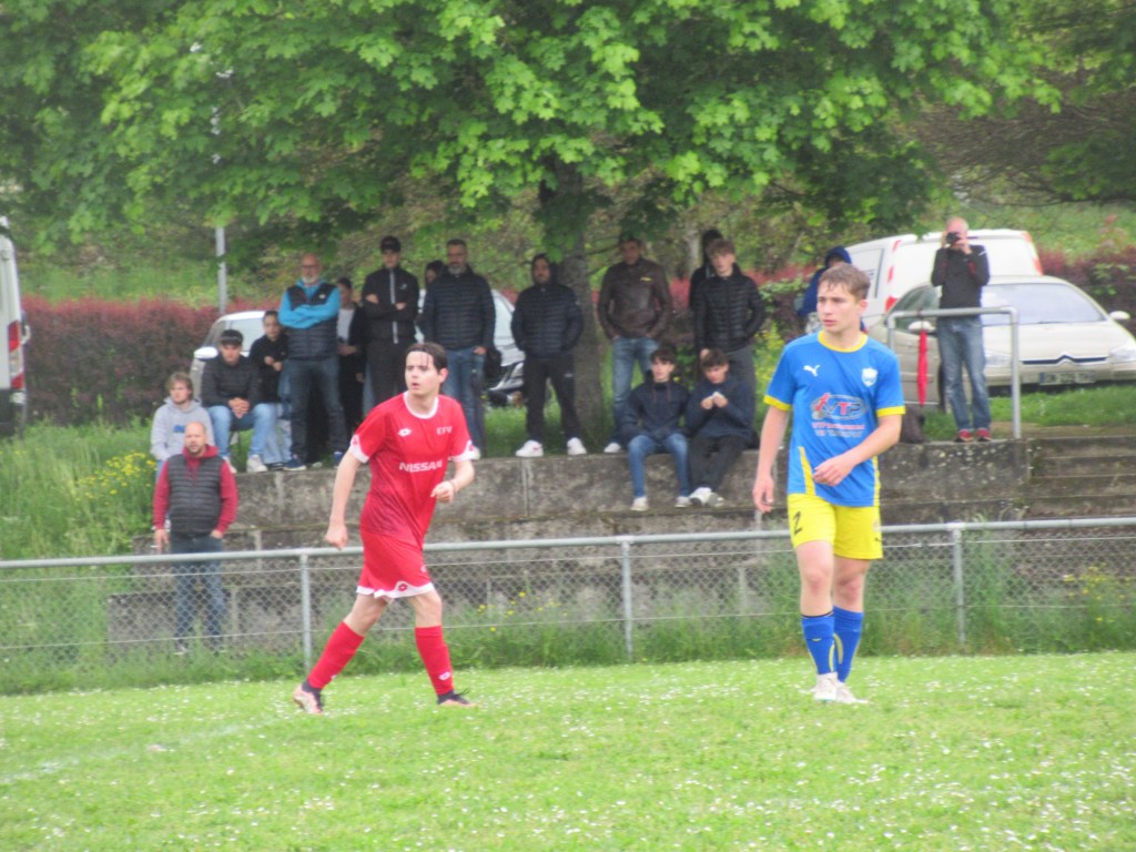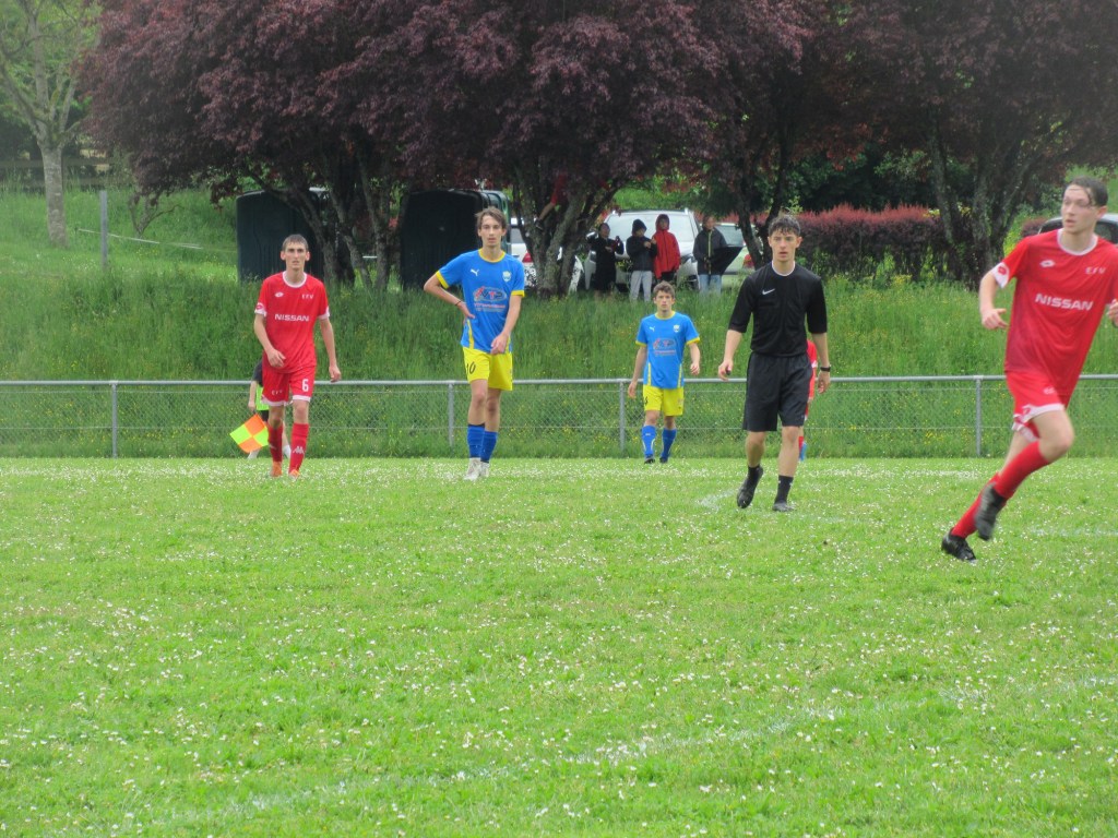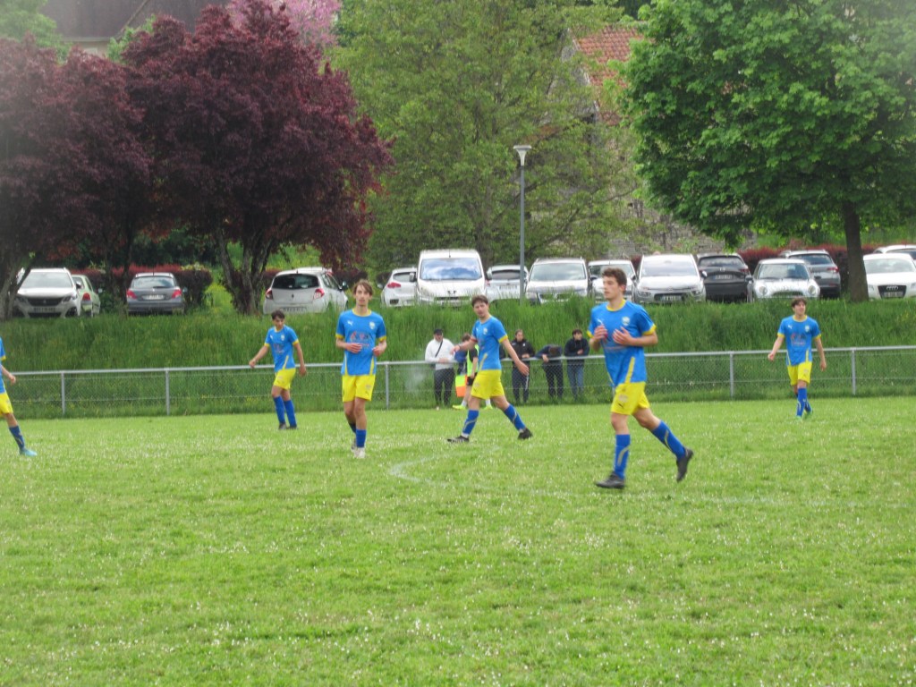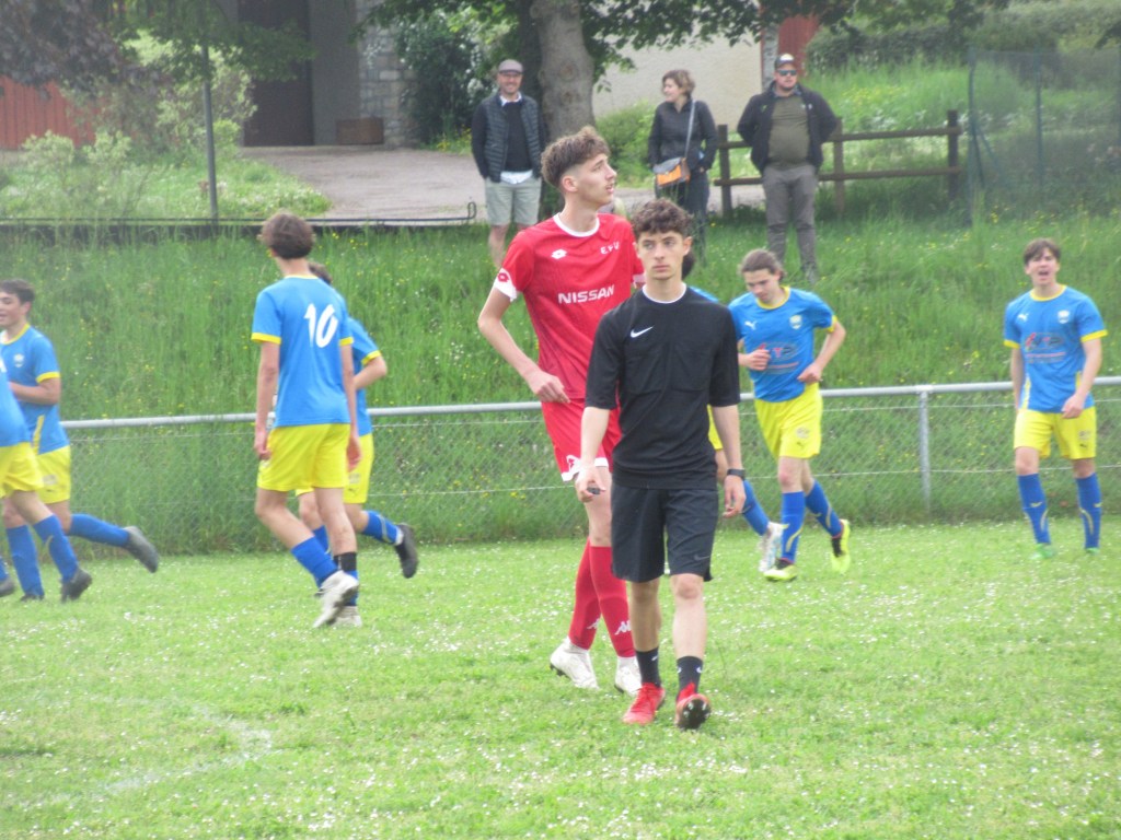 Le ton est très vite donné par les visiteurs qui imposent un gros rythme d’entrée de jeu. Mais les partenaires de Thomas plient l’échine et laissent passer l’orage. Et mettent progressivement le nez à la fenêtre. Il s’en faut de peu pour qu’un extérieur de Elno (ah le pied gauche…) ne fasse mouche. EF Villages n’est pas en reste mais une belle sortie de Louison perturbe l’attaquant adverse. Ca bataille ferme dans l’entre jeu et les occasions de but sont rares. Le 0 à 0 à la pause est des plus logique. Ne pouvant faire la décision, le situation agace quelque peu l’adversaire. Et les bleus en profitent. Simon hérite d’une superbe opportunité mais il se précipite et sa frappe sans contrôle (ah le contrôle cher à Platini) fuit le cadre. EF Villages pense avoir fait le plus dur en ouvrant le score de manière improbable. Un centre manqué lobe Louison, échoue sur le poteau….et rentre de quelques centimètres, 0-1. La frustration n’a même pas le temps d’apparaître sur les visages de nos protégés tellement leur envie de rétablir l’équilibre les anime ! Et ils vont y arriver par l’intermédiaire de Ilan qui laisse sur place ses deux gardes du corps et égalise d’une frappe tendue dans le petit filet, 1 à 1. La fin de match est irrespirable… On se rend coup pour coup…mais dans un très bon état d’esprit. On craint le pire lorsque l’avant centre adverse se procure une énorme occasion, mais Louison au prix d’une superbe détente dévie en corner. Les corners, tous très bien tirés, sont un véritable danger. Mais l’équipe fait preuve d’une générosité dans l’effort, d’une concentration extrême pour ne rien laisser lui échapper. Louison est un dernier rempart serein. Mehdi, Noé et Gaby puis Clément ont bouclé les côtés de main de maître. Dans l’axe Elie s’affirme de match en match comme un futur grand, Tristan fait plier son adversaire de deux mètres. Au milieu Hugo et ses grands compas récupère nombre de ballons bien aidé par Martin. Elouan prend du volume, Thomas fait apprécier sa technique pour la conservation du ballon. Ilan est intenable sur son côté. Simon par ses courses, Elno par son travail de sape mettent du coeur à l’ouvrage. Plus rien ne sera marqué, le score en reste à 1 à 1. Coach Jean-Luc peut être fier de ses troupes qui ont été héroïques, c’est le mot juste ! BRAVO. ainsi qu’à tous les joueurs non convoqués mais qui sont néanmoins venus faire corps avec leurs partenaires. Et que dire des parents sur la touche…