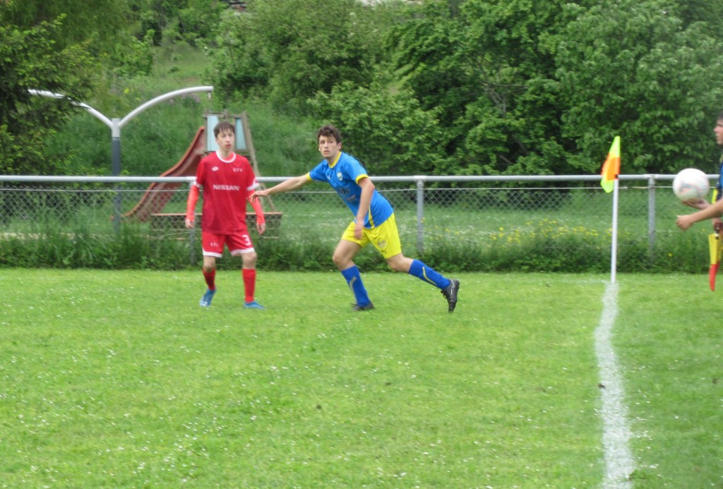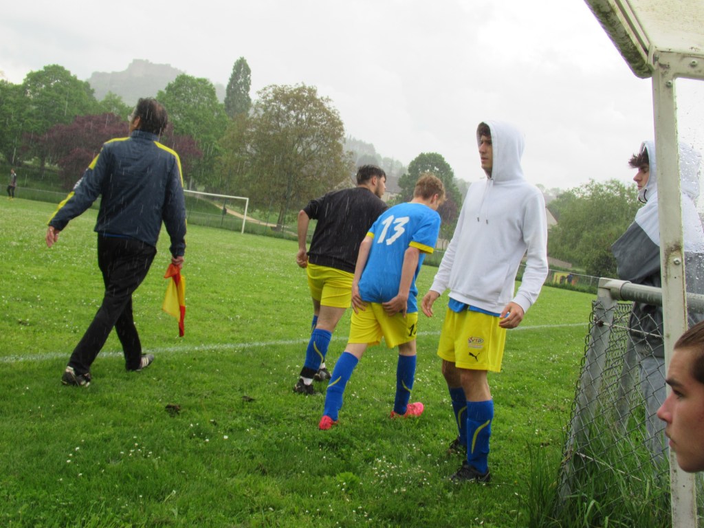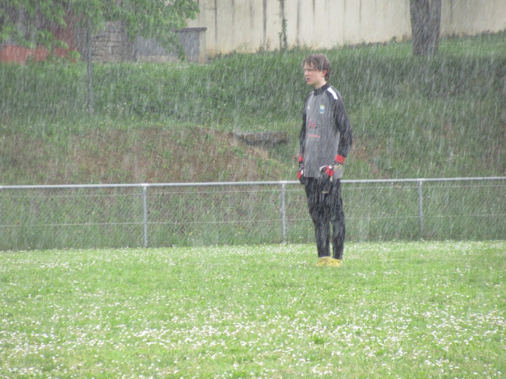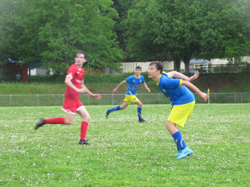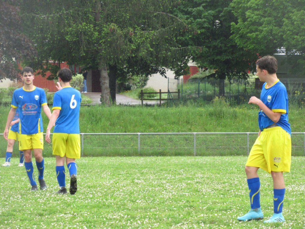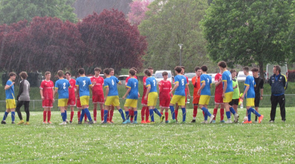 Le ton est très vite donné par les visiteurs qui imposent un gros rythme d’entrée de jeu. Mais les partenaires de Thomas plient l’échine et laissent passer l’orage. Et mettent progressivement le nez à la fenêtre. Il s’en faut de peu pour qu’un extérieur de Elno (ah le pied gauche…) ne fasse mouche. EF Villages n’est pas en reste mais une belle sortie de Louison perturbe l’attaquant adverse. Ca bataille ferme dans l’entre jeu et les occasions de but sont rares. Le 0 à 0 à la pause est des plus logique. Ne pouvant faire la décision, le situation agace quelque peu l’adversaire. Et les bleus en profitent. Simon hérite d’une superbe opportunité mais il se précipite et sa frappe sans contrôle (ah le contrôle cher à Platini) fuit le cadre. EF Villages pense avoir fait le plus dur en ouvrant le score de manière improbable. Un centre manqué lobe Louison, échoue sur le poteau….et rentre de quelques centimètres, 0-1. La frustration n’a même pas le temps d’apparaître sur les visages de nos protégés tellement leur envie de rétablir l’équilibre les anime ! Et ils vont y arriver par l’intermédiaire de Ilan qui laisse sur place ses deux gardes du corps et égalise d’une frappe tendue dans le petit filet, 1 à 1. La fin de match est irrespirable… On se rend coup pour coup…mais dans un très bon état d’esprit. On craint le pire lorsque l’avant centre adverse se procure une énorme occasion, mais Louison au prix d’une superbe détente dévie en corner. Les corners, tous très bien tirés, sont un véritable danger. Mais l’équipe fait preuve d’une générosité dans l’effort, d’une concentration extrême pour ne rien laisser lui échapper. Louison est un dernier rempart serein. Mehdi, Noé et Gaby puis Clément ont bouclé les côtés de main de maître. Dans l’axe Elie s’affirme de match en match comme un futur grand, Tristan fait plier son adversaire de deux mètres. Au milieu Hugo et ses grands compas récupère nombre de ballons bien aidé par Martin. Elouan prend du volume, Thomas fait apprécier sa technique pour la conservation du ballon. Ilan est intenable sur son côté. Simon par ses courses, Elno par son travail de sape mettent du coeur à l’ouvrage. Plus rien ne sera marqué, le score en reste à 1 à 1. Coach Jean-Luc peut être fier de ses troupes qui ont été héroïques, c’est le mot juste ! BRAVO. ainsi qu’à tous les joueurs non convoqués mais qui sont néanmoins venus faire corps avec leurs partenaires. Et que dire des parents sur la touche…