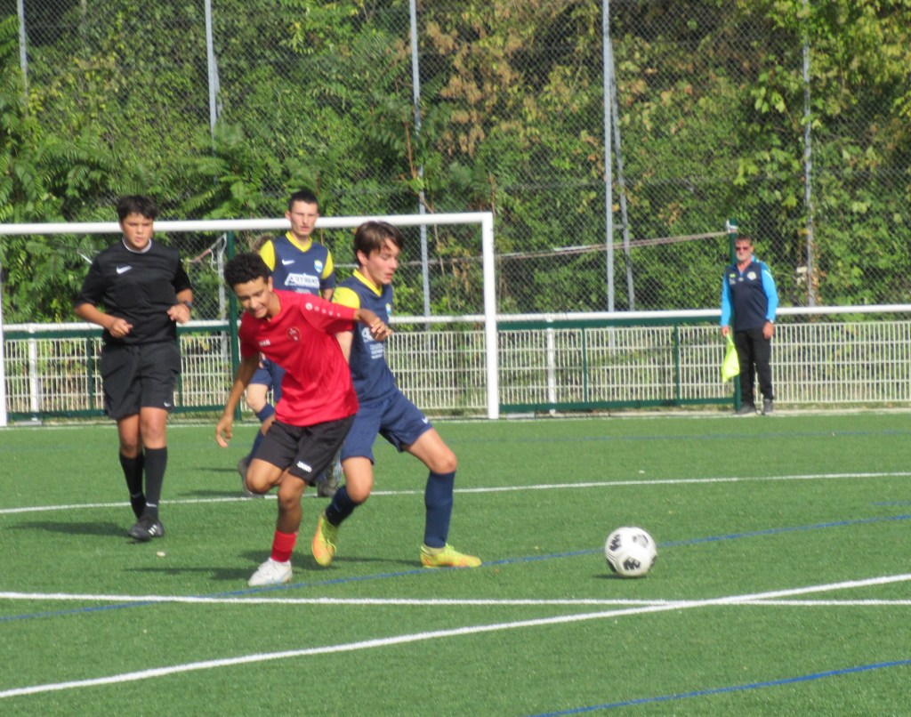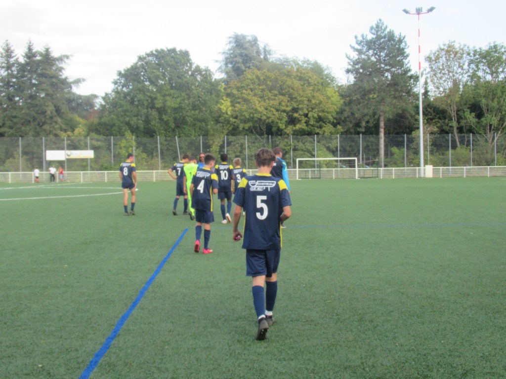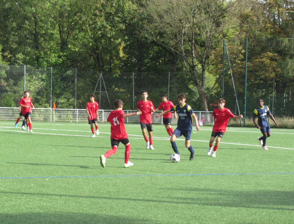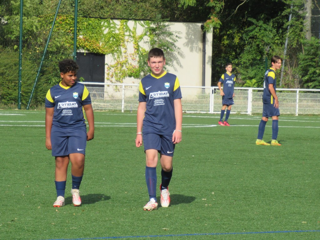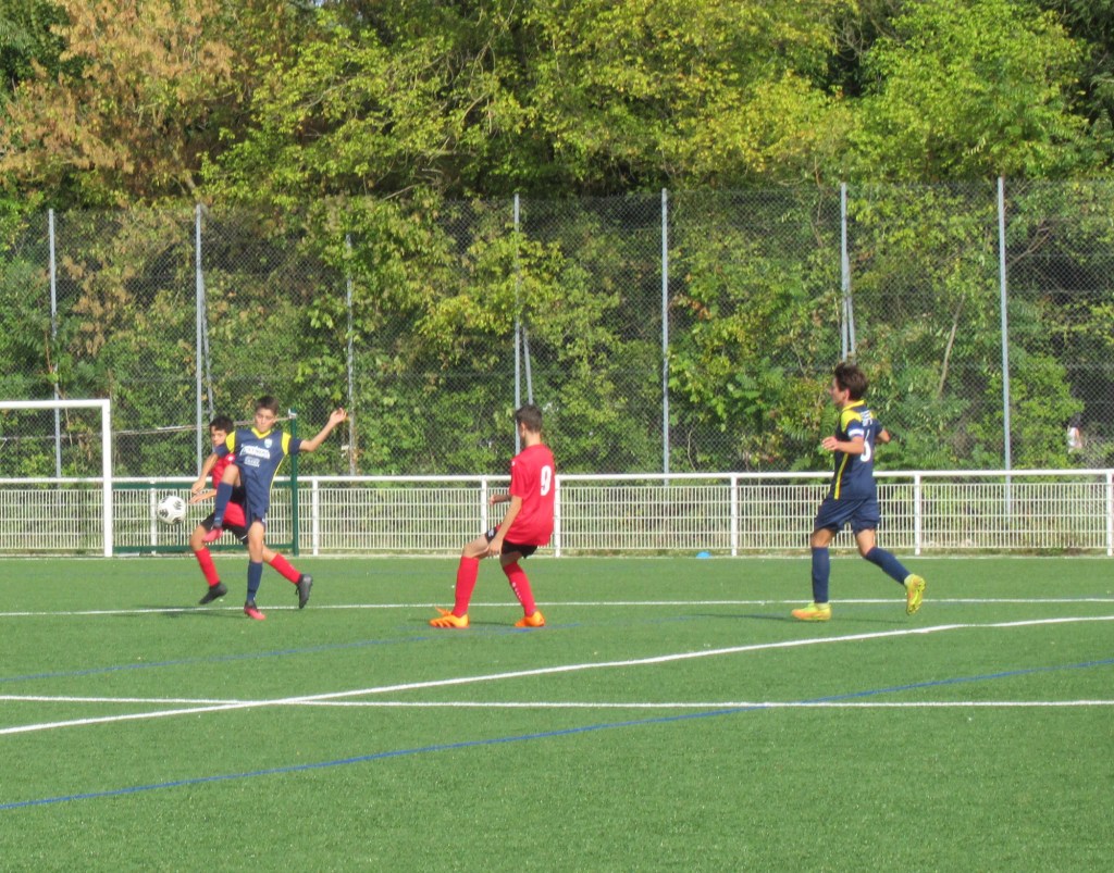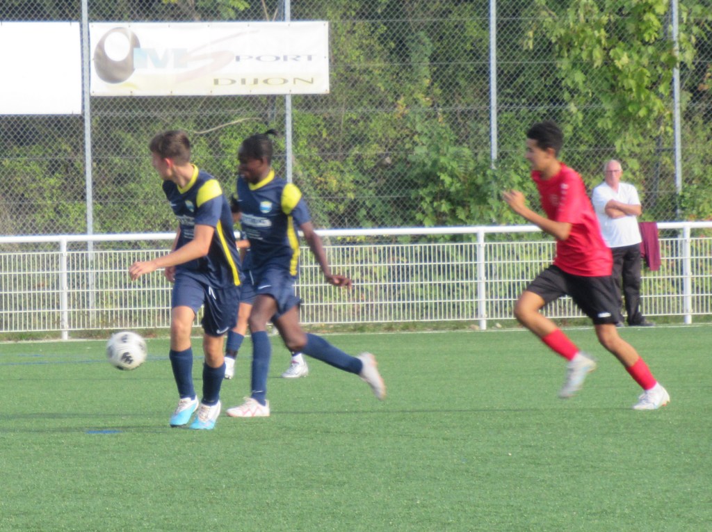 Victoire tranquille des U15 même s’ils se sont mis en difficultés tous seuls en laissant les locaux revenir à 2-1. D’entrée de jeu les partenaires d’Andréa imposent leur jeu et font la différence dès le premier quart d’heure avec des réalisations de Maxime qui, bien servi par Louis A, mystifie deux défenseurs dans la surface et vient battre le gardien d’un plat du pied sobre et efficace. Jephthé l’imite deux minutes plus tard en profitant d’une belle déviation de Mattéo. Les occasions se multiplient. Une tête astucieuse de Maxime trouve la transversale. Puis inexplicablement l’ailier droit adverse pénètre dans la surface sans que personne ne vienne l’attaquer. Il a tout e temps d’ajuster Gabin d’une belle frappe. Dijon ULFE revient à 2 – 1 sur sa seule occasion ! En seconde période, l’Entente se donne de l’air par Louis C qui marque de prêt. Les occasions se succèdent. Jephthé ajoute un quatrième but après un bel enchaînement à l’entrée de la surface, 4 à 1. Gabin nous gratifie de deux belles sorties qui soulagent la défense. La malchance poursuit Maxime qui, cette fois, trouve la base du poteau. Avec un peu plus de lucidité, l’addition aurait pu être beaucoup plus lourde.