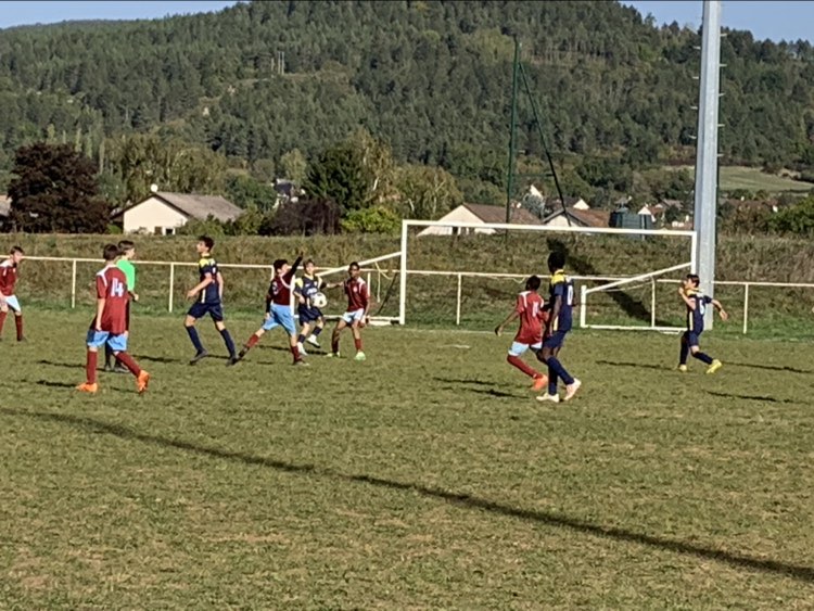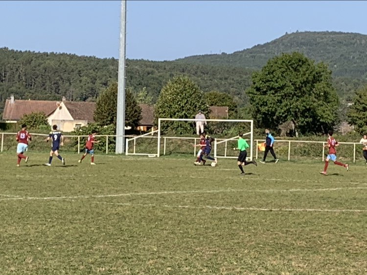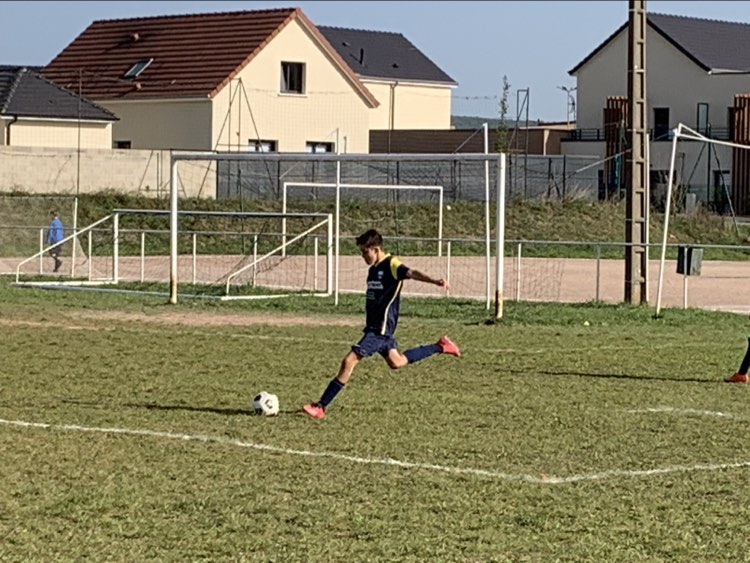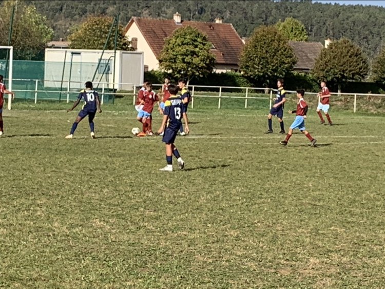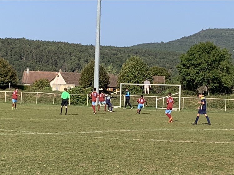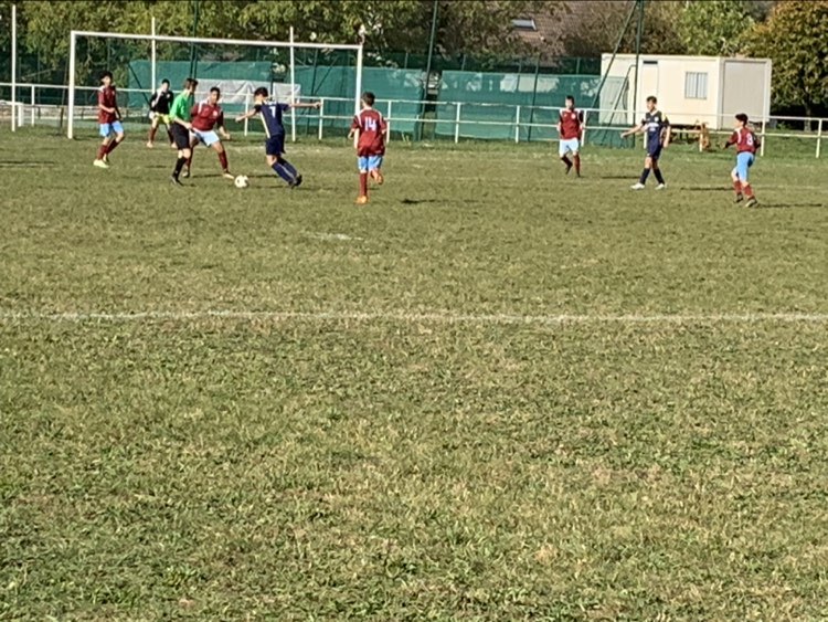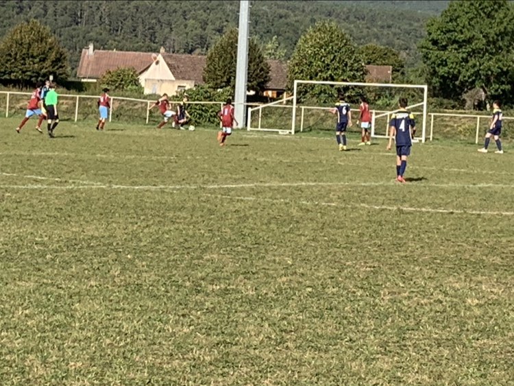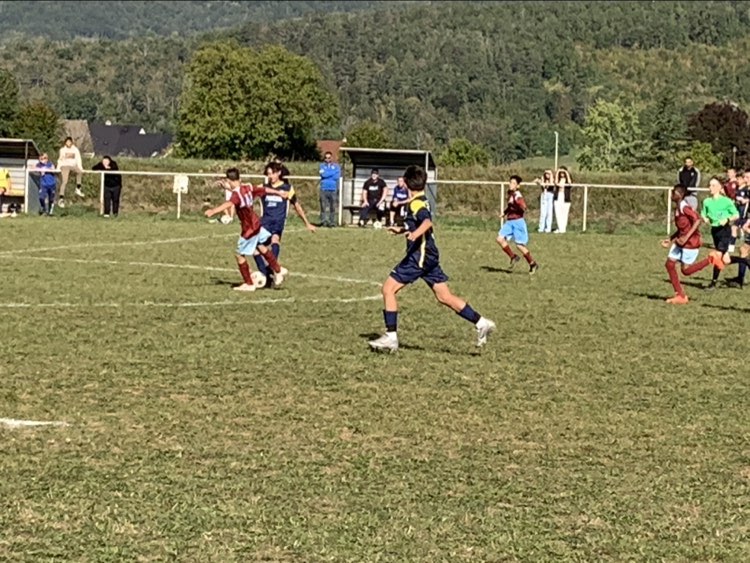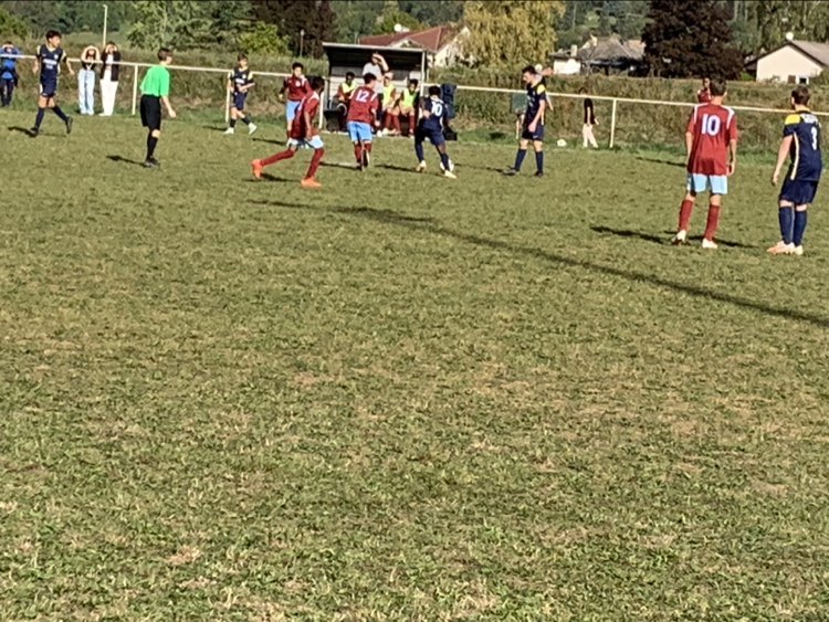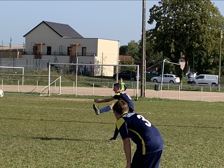 Un match bien frustrant. Certes il y avait une belle équipe en face, mais la passivité affichée en première mi-temps permet aux visiteurs de mener 4 à 0 à la pause… Après le repos, Maxime mène la révolte. Et on est beaucoup plus agressif avec un pressing plus haut. Les milieux récupèrent de bons ballons dont profitent les attaquants. D’une frappe de 20m Maxime trouve les filets, et ce but remonte le moral des troupes. Ca pousse, ça pousse. On récupère des ballons plus haut. La défense adverse n’est ps sereine quand on la presse. Louis C en profite pour ramener le score à 2-4. Mais l’entente se remet dans la mouise en encaissant un coup franc que tout le monde regarde passer sans essayer d’intervenir..2-5. On repart de l’avant, et c’est Mattéo qui met le but de l’espoir, 3-5. Un joli vent de folie souffle sur le stade qui sent que l’exploit pourrait avoir lieu… Mais c’est un jour sans… Les bleus se font cueillir sur deux contres, 3-7. Joli sursaut d’orgueil qui permet de ne pas perdre la seconde mi-temps.