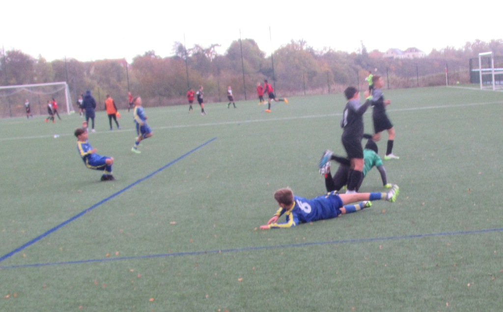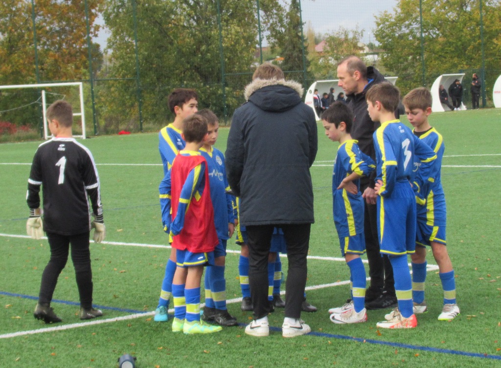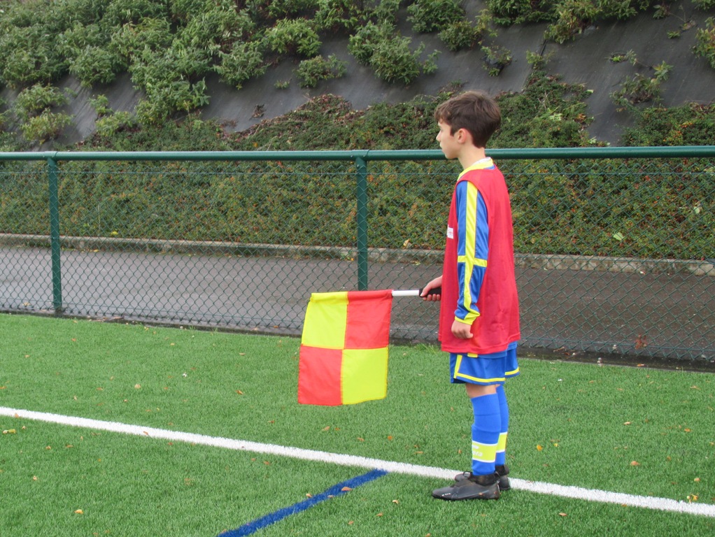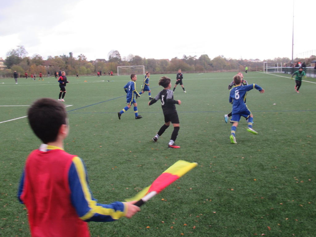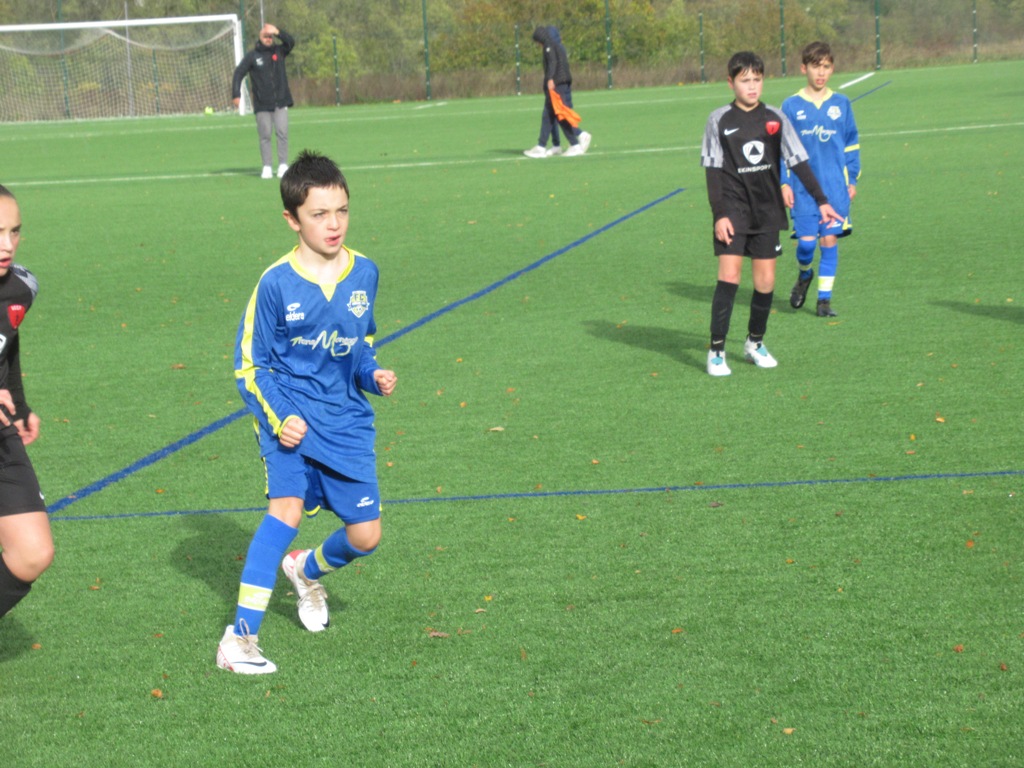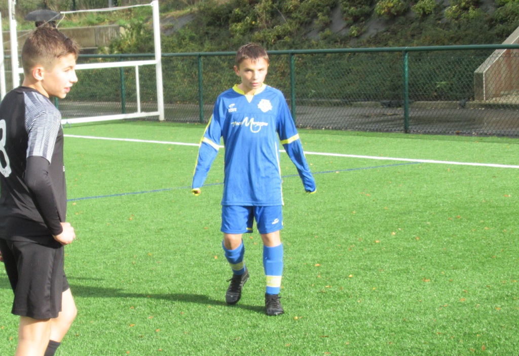 Face à un sérieux prétendant à la montée, nos jeunes pousses ont souffert dans l’enfer glacial du nord (pluie et vent). Malmenés pendant les 3/4 de la rencontre, les partenaires de Martin ont sorti le grand jeu dans le dernier quart temps pour ramener un nul inespéré. Les bleus sont littéralement privés de ballon pendant la première période, et c’est un petit miracle d’atteindre la pause avec un seul but de retard. Et ça recommence après le repos. Il faut que Samuel reste concentré et sorte quelques parades mais il devra s’incliner une seconde fois, 0-2. Et arrive le dernier quart temps. Et nos petits bleus sortent du diable vauvert pour terminer gonflés à bloc. Il faut d’abord une double parade du gardien pour empêcher Arthur de marquer. Sur le contre UCCF est à deux doigts de faire le break. Se ne sera que partie remise. Quelques minutes plus tard. Arthur sert Noé seul au deuxième poteau. Notre petit lutin a le temps de contrôler et d’ajuster une mine sous la transversale, 1-2. Ca pousse, ça pousse… Liova a une occasion que l’on qualifie habituellement d’immanquable…et pourtant… Dernière minute, une ultime percée d’Enzo dans la surface…et il se fait découper par derrière… Pénalty que transforme avec sang froid Liova, 2-2. Nos petits bleus reviennent indemnes de l’enfer du Nord. BRAVO !