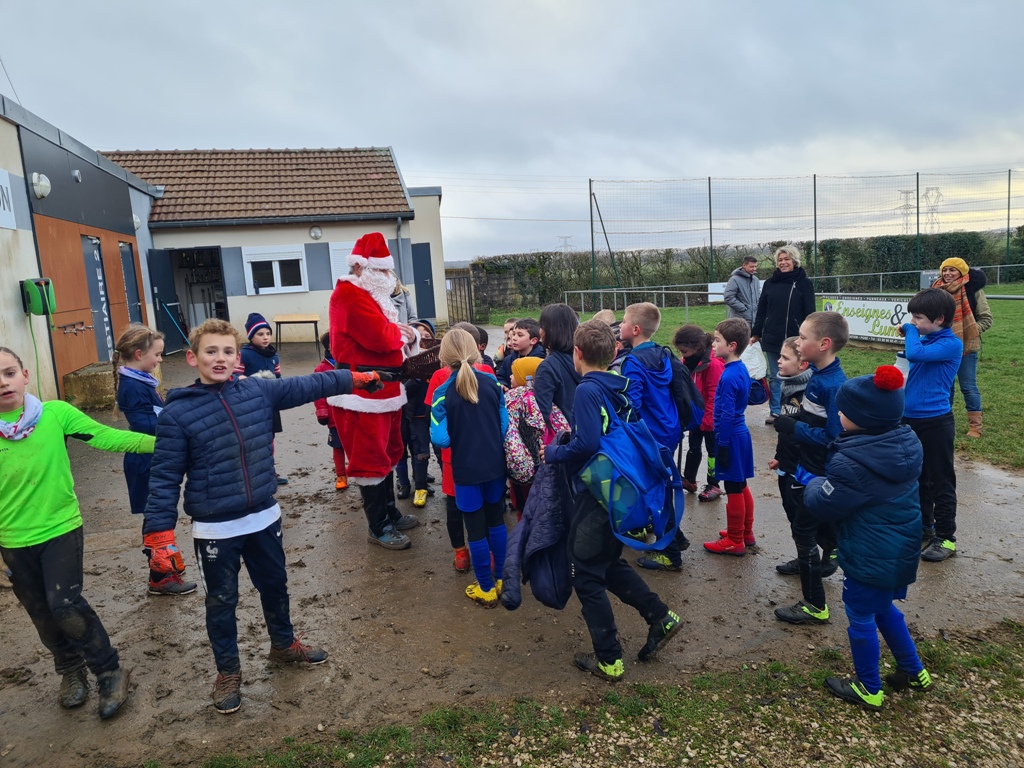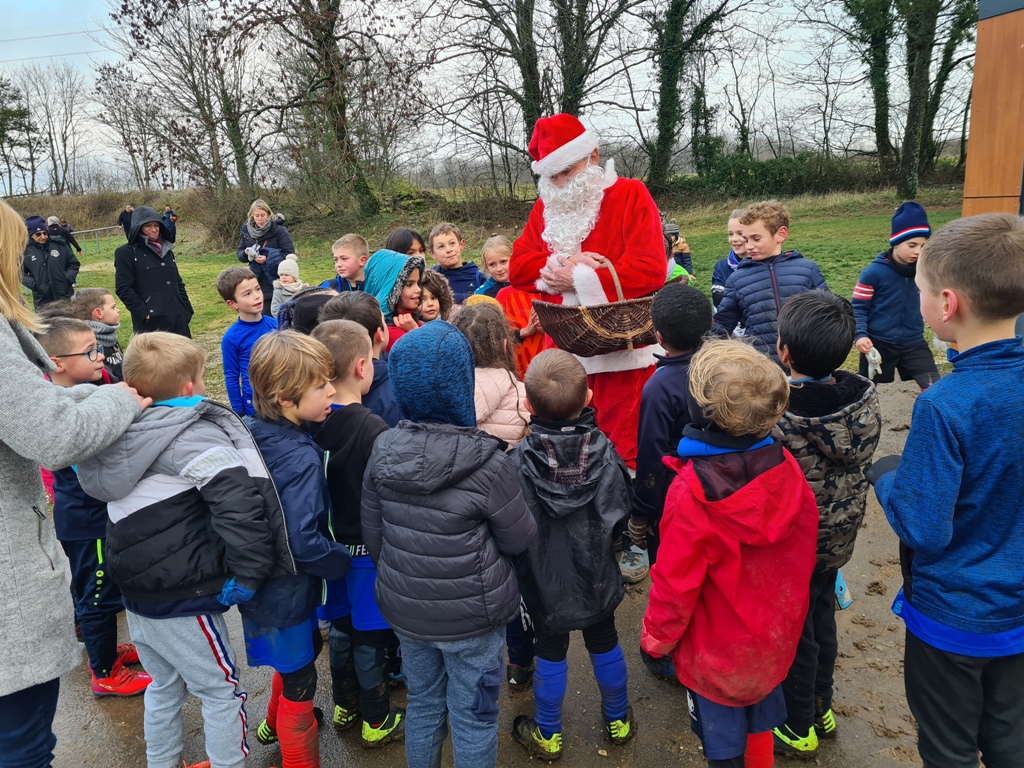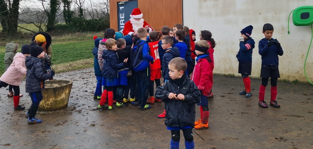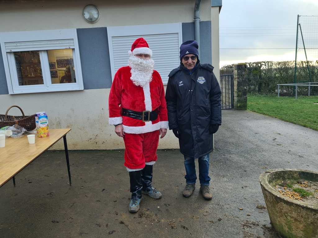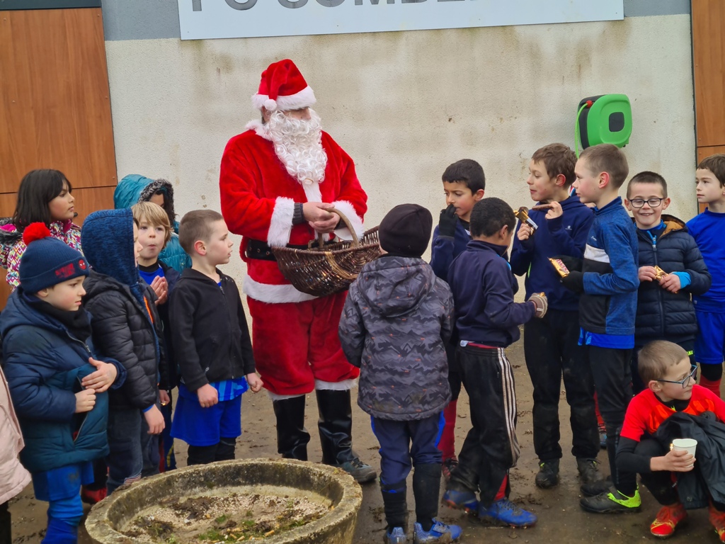 L’entraînement des U7 et U9 touchait à sa fin lorsqu’une figure emblématique a franchi la porte du stade de l’Epine – Marcel David ! Le Père Noël en personne est venu rendre visite à nos petits footballeurs en herbe. Et il s’est montré très généreux, distribuant bonbons et papillotes à nos jeunes bambins. Après avoir pris la pose pour la photo souvenir, le héros du jour s’est éclipsé discrètement pour poursuivre sa tournée. Une bien belle journée pour nos jeunes footeux !