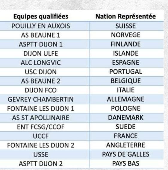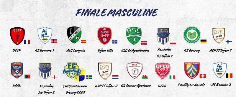 Disputé sous la forme d’un tournoi façon Euro, 16 équipes sont présentes : UCCF, Beaune 1 et 2, Longvic, Dijon ULFE, St Apollinaire, Fontaine les Dijon 1 et 2, Gevrey, USC Dijon, USSE, ASPTT Dijon 1 et 2, DFCO, Pouilly et le petit poucet l’entente FCSG-CCOF (nos jeunes pousses représenteront la Suède). Notre équipe joouera son premier match à 10h25 contre le Portugal (USC Dijon).