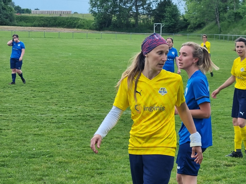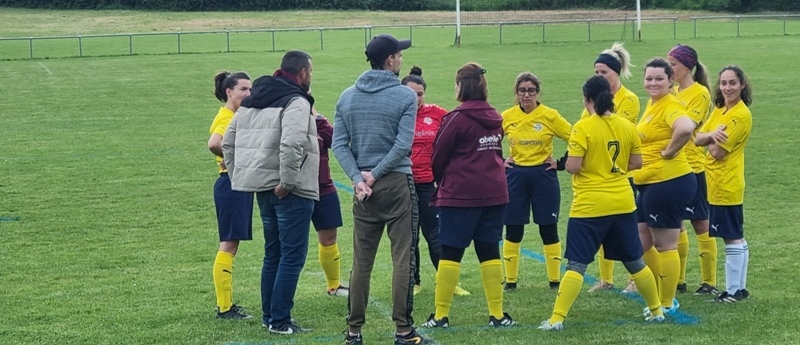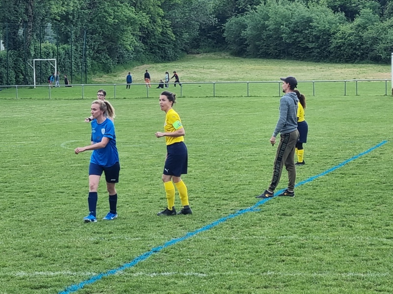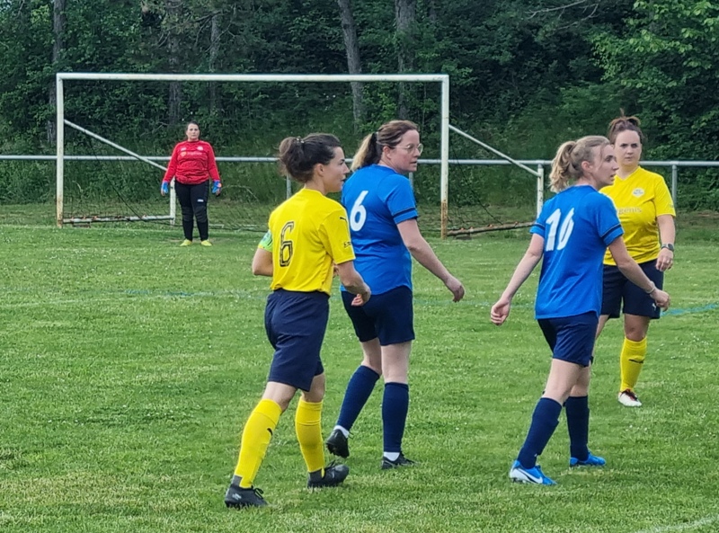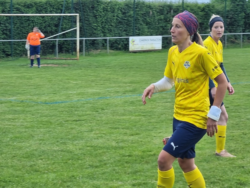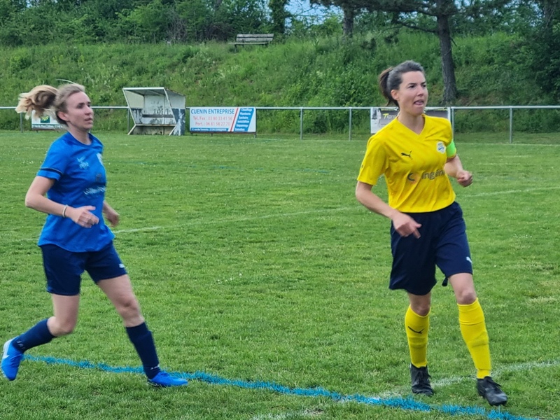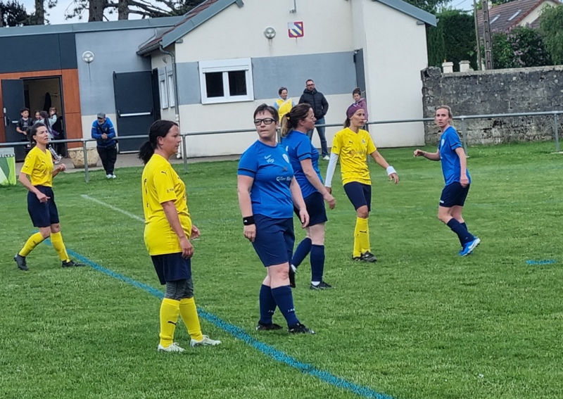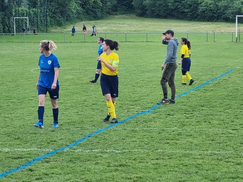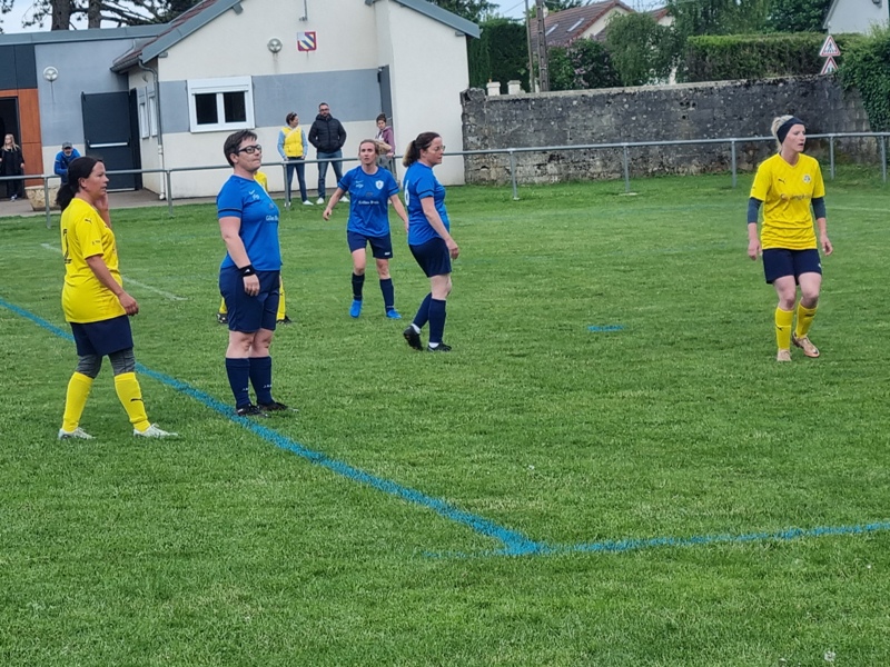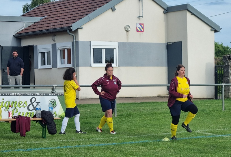 Victoire plus nette que ne l’indique le score pour nos tigresses face à Beaune. Bien organisées autour de Alice qui donne le tempo dans l’entre jeu, les jaunes ouvrent rapidement le score par Aline. Les attaques se succèdent, et Aline s’offre un doublé pour son anniversaire d’une superbe aile de pigeon, 2 à 0. Les visiteuses profitent d’un cafouillage devant le but pour revenir à 2-1. Amandine pèse sur la défense adverse. Juste avant la pause, Alice à l’affut pousse le cuir, relâché par la gardienne adverse, dans le but vide, 3-1. En seconde période, le jeu est plus laborieux. On assiste à une rude bataille au milieu de terrain. Marlène s’offre une balle de but, mais la gardienne beaunoise réussit un bel arrêt. A quelque minutes de la fin une visiteuse reprend victorieusement une frappe repoussée par Julie, 3-2. Mais nos tigresses tiennent sereinement les quelques minutes qui restent pour s’offrir un succès largement mérité !