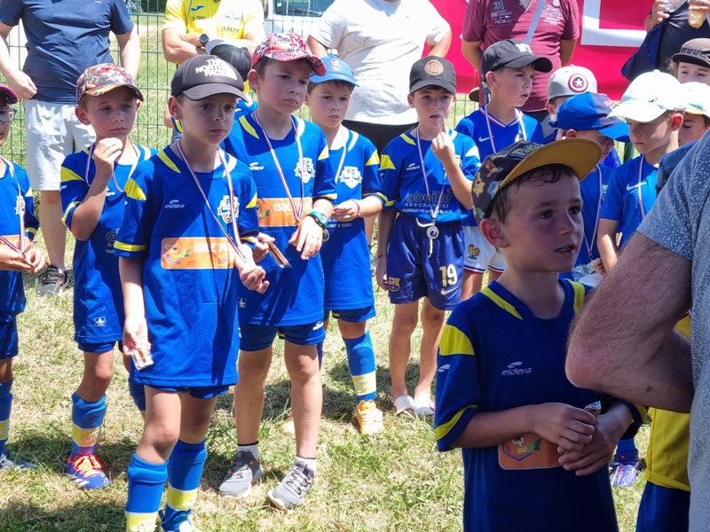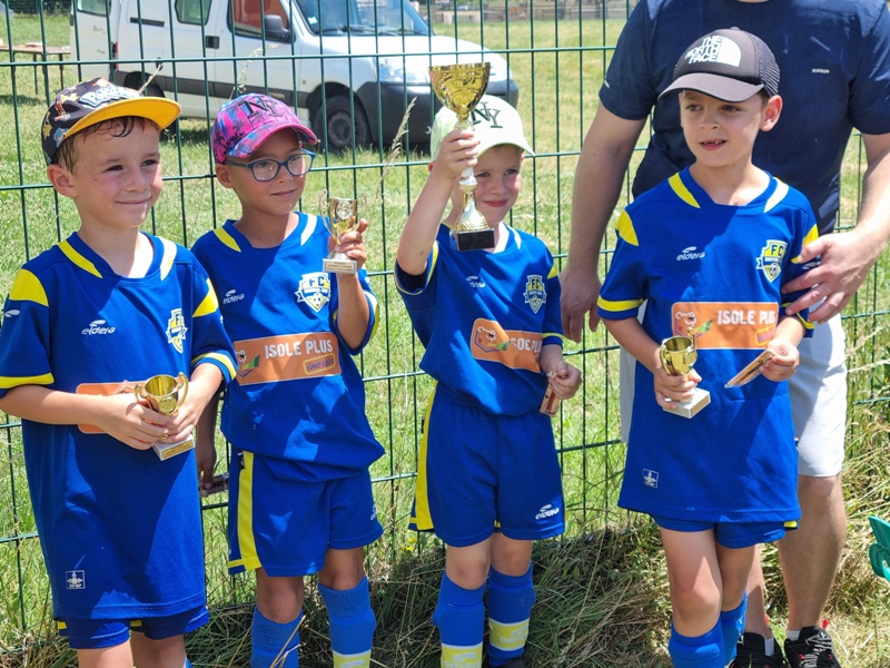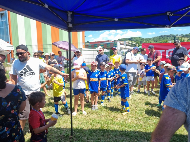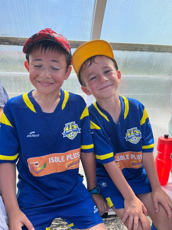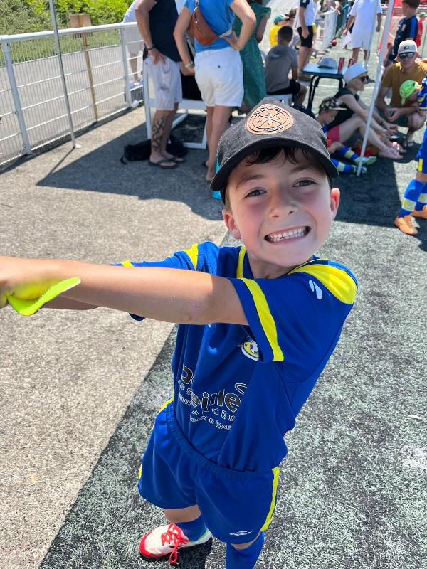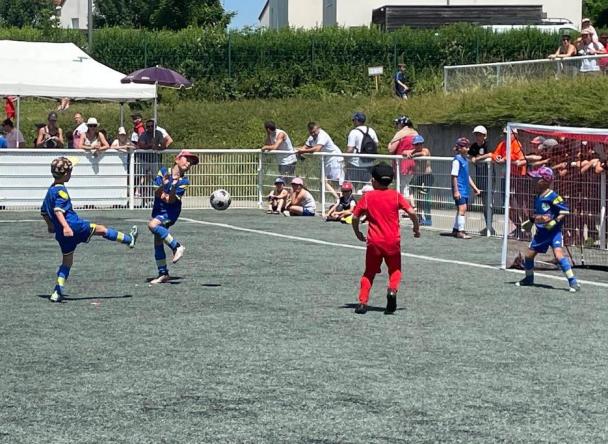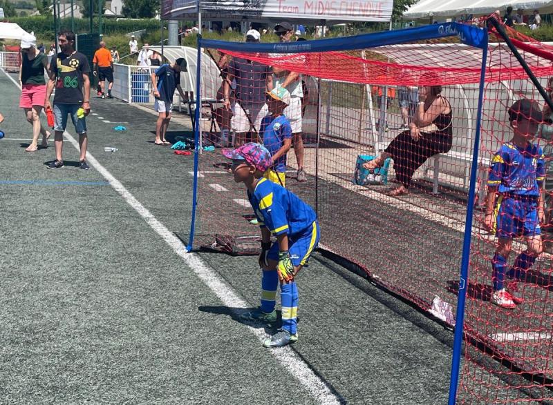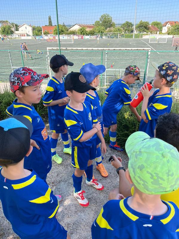 Avec application et envie les petits bleus remportent match après match malgré la chaleur qui monte rapidement et chauffe les crampons sur le synthétique. Seule une équipe nous fait barrage lors des phases de poule mais la deuxième place est acquise ce qui satisfait coach Adrien. Un petit espoir d’une final 100 % FCSG est elle possible ? Les garçons restent motivés et assurent leur passage en 1/2 finale contre UFCO pour un gros derby. Ca joue pas mal du tout mais aucune équipe trouve le chemin des buts …..Ca va se jouer aux tirs au but ! Noah prend la responsabilité des gants , Axel se lance et ça passe. Kalvin trouve son tir arrêté par le gardien très bien placé. Aloïs tout en force à droite. Et deux arrêts de Noah nous envoient en finale !! Bravo 🎉L’histoire se répète. On rejoue le match de poule perdu.. avec l’espoir de revanche. En finale nos vaillants soldats se procurent quelques actions sans conclure. Lacanche pousse et le public pousse et la chaleur monte… Lacanche est réaliste à 3 fois par des frappes fortes. Noah réduit le score mais la victoire est acquise pour Lacanche. Sans regrets car tous ont été chercher leurs dernières forces avec mention spéciale à notre benjamin Bastien qui avec courage a pris place au cage et a pu aider ses coéquipiers sur le terrain pour cette finale !