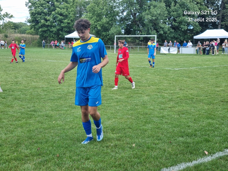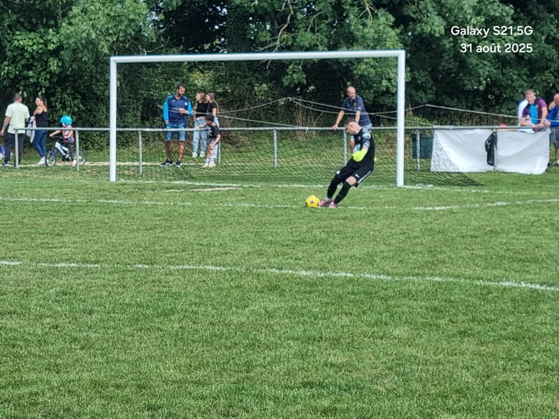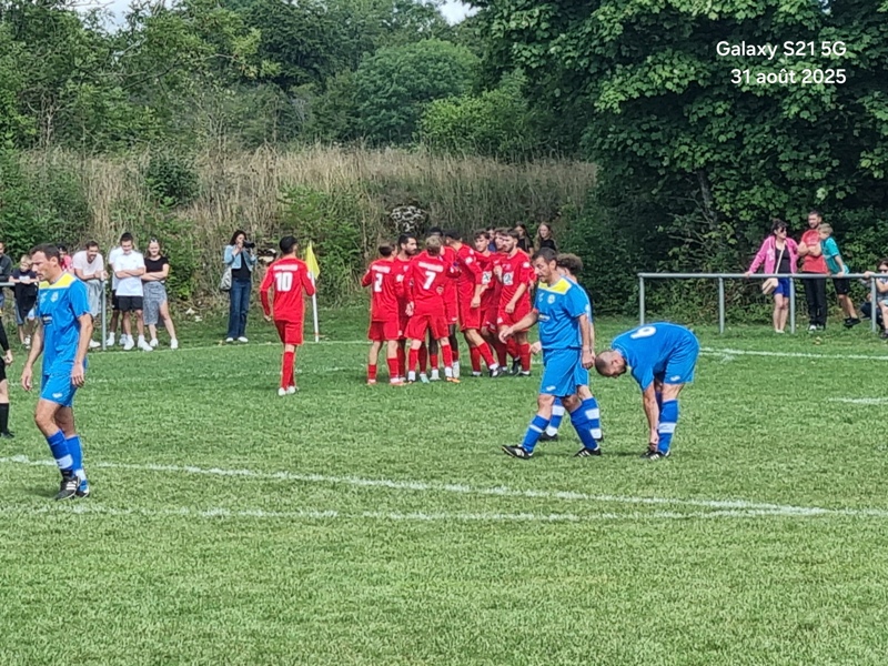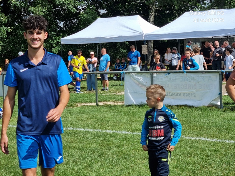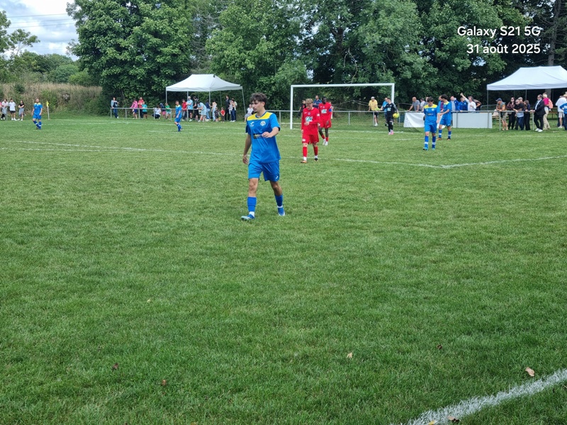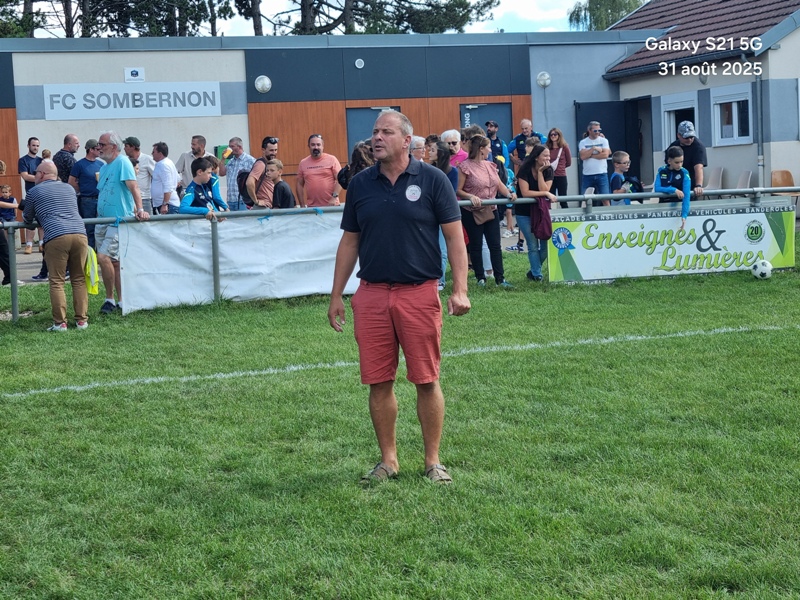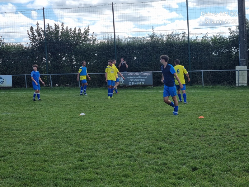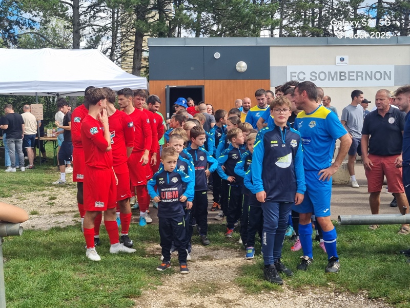 Presque 400 personnes étaient accoudées aux mains courantes du stade, parmi lesquels se trouvaient Michel Roignot, maire de Sombernon qui a donné le coup d’envoi d’un joli plat du pied gauche et Alain Lamy, conseiller départemental. Le club a voulu bien faire les choses et réserver aux forgerons un accueil digne de leur standing. Les jeunes du club (U9, U11 et U13) ont accompagné les deux équipes au coup d’envoi et leurs ont fait une haie d’honneur à l’issue de la rencontre. Rencontre qui a été sans surprise. Dès la 10ème, les visiteurs ouvrent la marque sur corner, 0-1. Suite à un renversement de jeu côté gauche et un beau mouvement collectif, les forgerons inscrivent un 2ème but, 0-2. Un raid de Clément côté droit, une percée plein axe de Saïd laissent entrevoir un brin d’espoir. Mais les geugnonnais font le break juste avant la pause, 0-3. On tente de remobiliser les troupes à la pause. Surtout d’avoir une meilleure organisation défensive pour ne pas prendre le bouillon. Et ça tient plutôt bien. Une double parade exceptionnelle de Pierrot permet de sauver les meubles. Gueugnon fort de son expérience mène le match à son rythme et inscrit même un quatrième but en fin de rencontre, 0-4. Un match disputé dans un très bon état d’esprit avec du respect l’un pour l’autre, ce qui a permis au trio arbitral de passer un après midi tranquille. BRAVO à nos petits bleus et au staff Sébastien Garrot assisté de Matéo Faivre pour avoir fait de cette journée une belle fête du football.