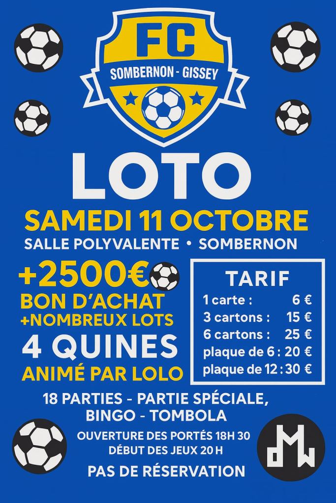 Ce samedi 11 octobre, le Football Club de Sombernon-Gissey organise sa traditionnelle soirée loto à la salle polyvalente de Sombernon.