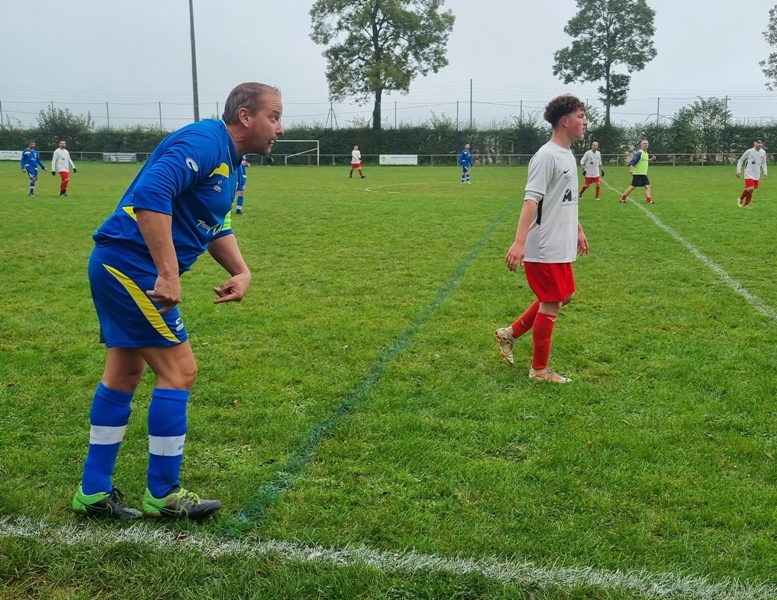 Très bonne mi-temps de notre équipe réserve qui domine complètement l’adversaire en menant 2 à 0 à cinq minutes de la pause. Malheureusement les visiteurs marque un but sur une cagade de notre défense 2-1 à la mi-temps. A la reprise les visiteurs égalisent sur un superbe coup franc, 2-2. Mais notre équipe ne lâche rien dans ce derby. Les bleus obtiennent un penalty et Corentin ne tremble pas et loge la balle au fond des filets, 3-2. Très belle victoire dans ce derby.