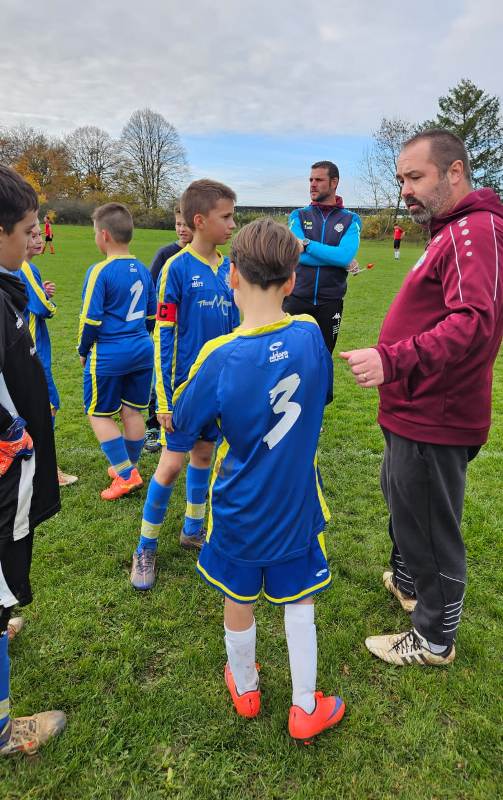 Dès le début du match Quetigny est dans notre camp mais la défense est bien en place et repousse les différentes offensives. Un contre bien mené aurait pu nous permettre d’ouvrir le score mais Axel touche l’extérieur du poteau. Quetigny mettra finalement les premiers buts sur 2 percées individuelles. L’équipe ne baisse pas les bras et sur une longue chevauchée de Clément côté droit depuis son camp, son centre est repoussé par le gardien et Axel bien placé pousse le ballon dans les filets adverses pour la réduction du score. Quetigny marque ensuite le troisième but sur pénalty avant la mi-temps. La reprise est assez similaire et Quetigny marquera 3 autres buts sur coups de pieds arrêtés donc un malheureux but sur corner contre notre camp. La fatigue se fait sentir dans la fin du match mais l’équipe continue à être combative. Les efforts payent et Nolan obtient un penalty sur une grosse faute commise sur lui. Le penalty est transformé par Axel sur un beau contre pied. Score final 2 à 6.