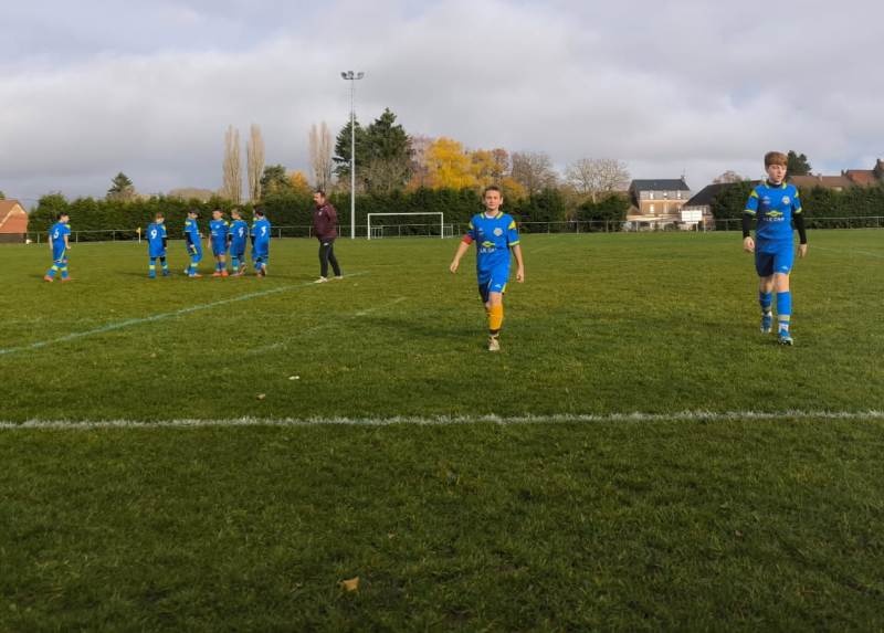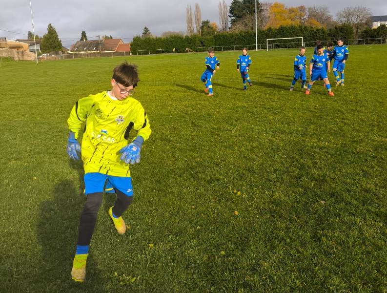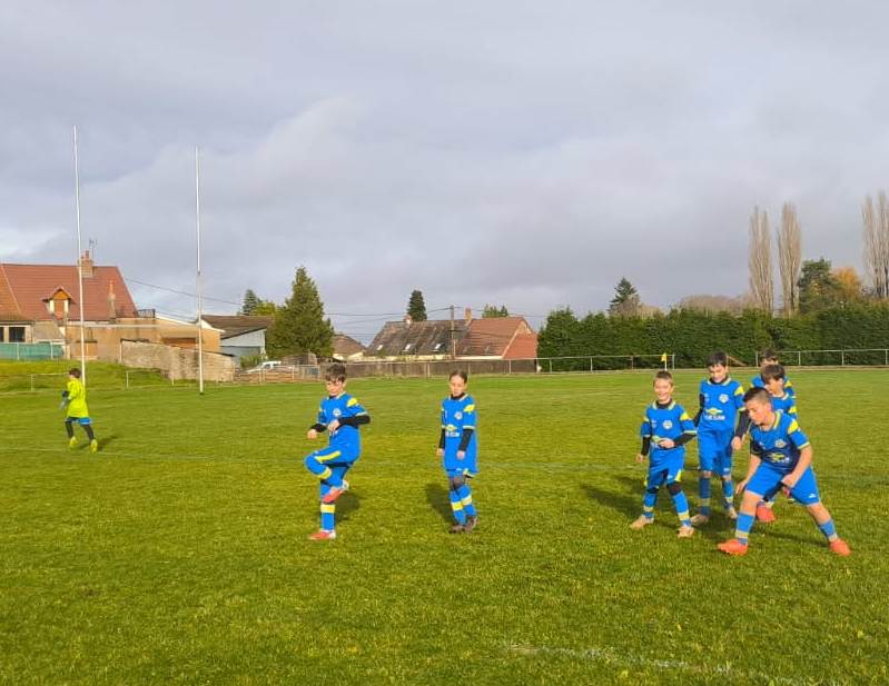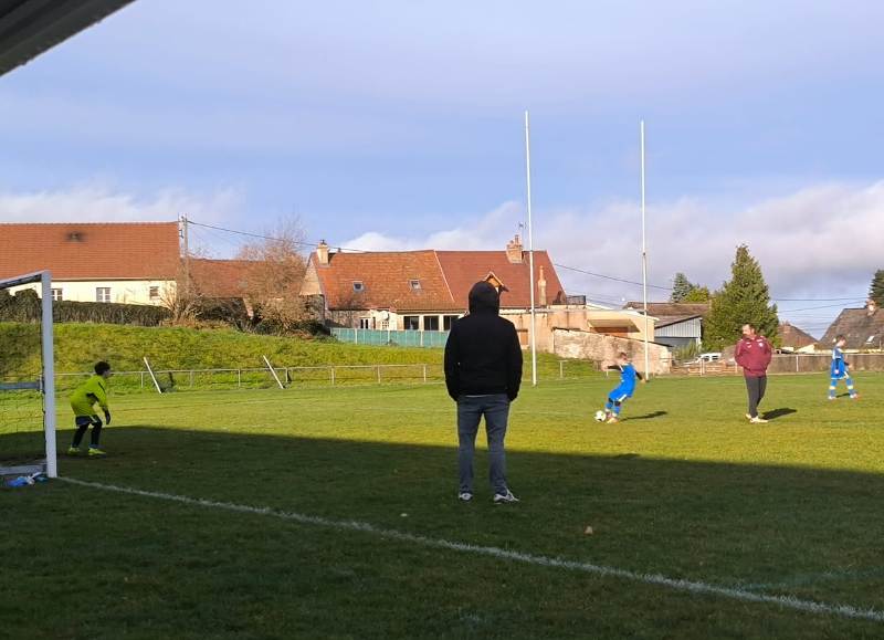 Match important face à Morvandelle-Moux pour cette 7ème journée de championnat. Les 2 équipes sont à égalité de points avant cette rencontre. Nos jeunes entament très bien la partie. Ils sont bien en place et se créent plusieurs opportunités. De son côté, l’équipe adverse agit en contre, mais la défense est bien en place et conserve la parité. Une attaque bien menée vers la 10ème voit Nolan ouvrir le score sur une frappe croisée, 1-0. L’équipe continue a pousser et les efforts sont récompensés. Mahé du bout du pied porte le score à 2-0. Les locaux ne lâchent pas et réduisent le score sur un coup franc direct dévié sur la barre par Eden mais qui malheureusement passe la ligne de quelques centimètres, 2-1. Les bleus sont réactifs, et enchaînent rapidement avant la mi-temps par 2 buts d’Axel et Raphaël, 4-1 à la pause. Reprise pour la dernière demi-heure, l’entente Morvandelle-Moux est offensive mais les défenseurs tiennent la baraque. Une offensive et un centre bien construit côté droit permet à Raphaël de pousser le ballon dans le but, 5-1. Nos jeunes continuent les attaques et sont récompensés par une enroulée d’Alexy et une belle frappe pied gauche côté opposé d’Axel qui finira dans le petit filet pour clôturer le score. Belle victoire de nos jeunes pour ce match, le plus abouti de la saison. Résultat final 7-1.