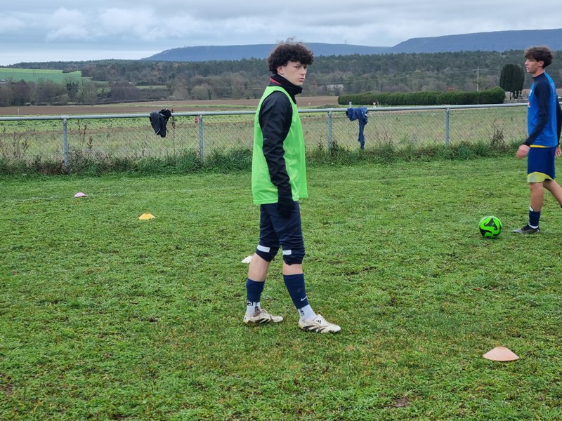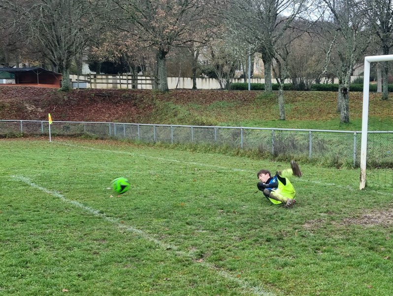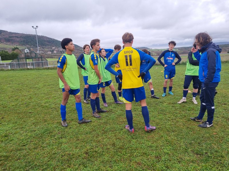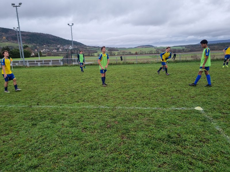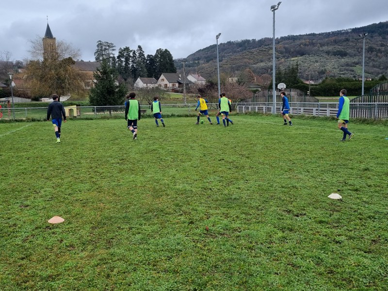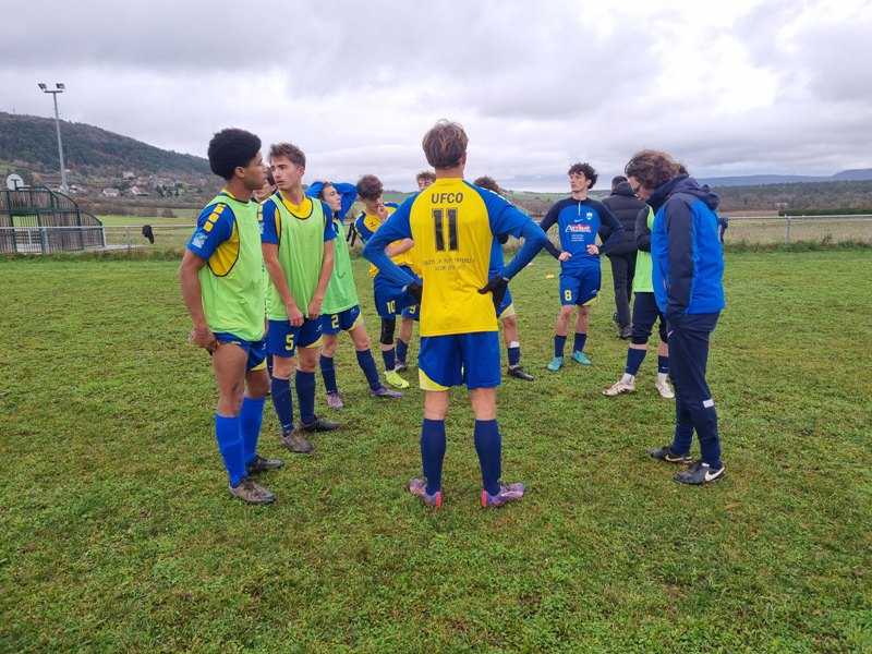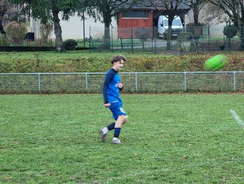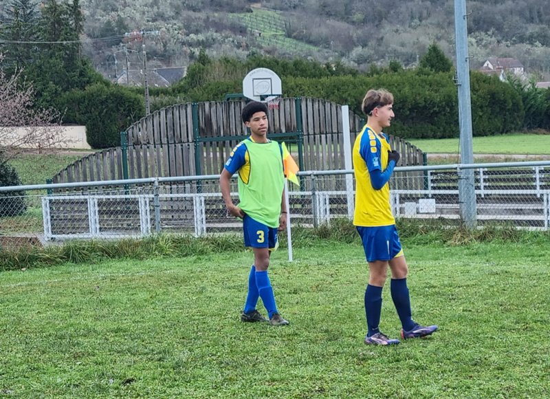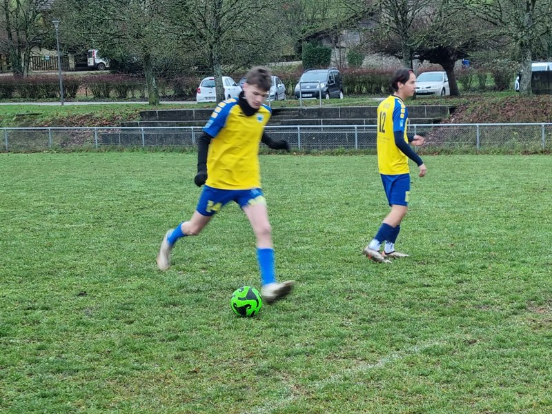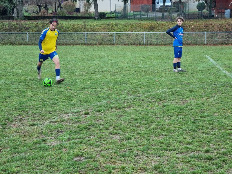Les visiteurs ouvrent rapidement sur le score sur coup franc. Gabin apprécie mal la trajectoire et doit s’incliner, 0-1. Les jaunes mettent le bleu de chauffe pour venir s’installer dans le camp adverse. Les occasions sont là. Et l’égalisation vient logiquement sur une frappe croisée de Kilian, 1-1. Mattéo, Louis et Loïc ont des balles de 2-1, mais la réussite les fuit. 1-1 à la pause. Bis répétita après le repos. On essaye beaucoup, mais le gardien multiplie les parades décisives. Au bout du bout du temps additionnel, on tarde à dégager un ballon chaud. Suite à un cafouillage dans la surface, l’avant centre adverse trouve la faille au milieu d’une forêt de jambes et donner la victoire aux siens, 1-2. Cruel !