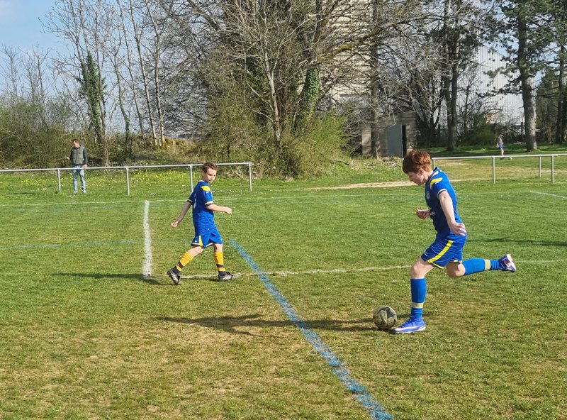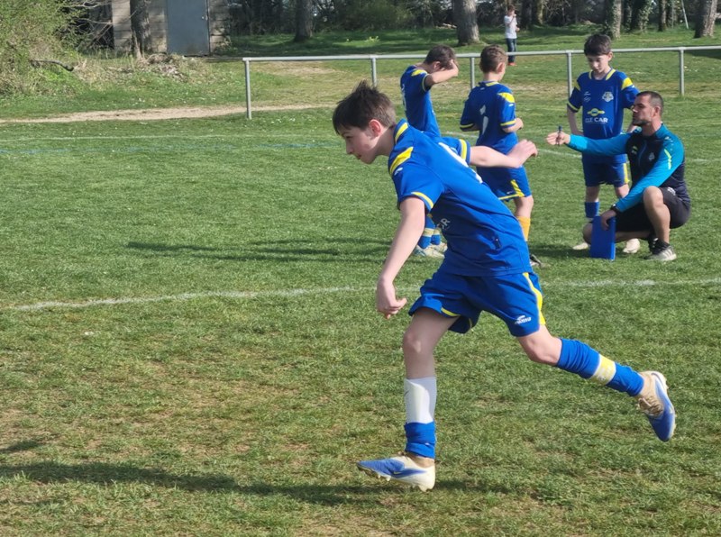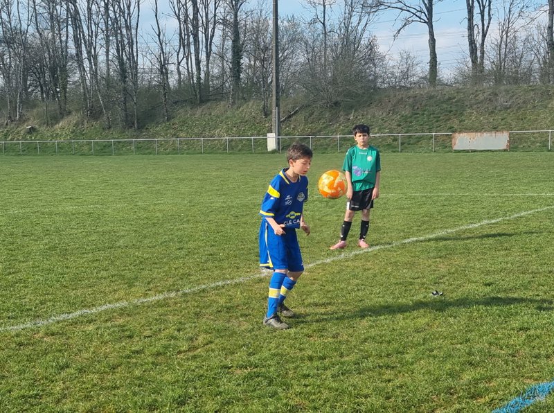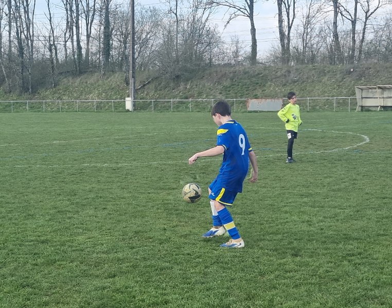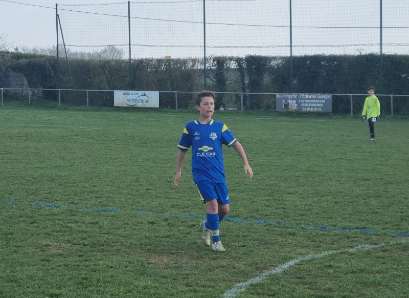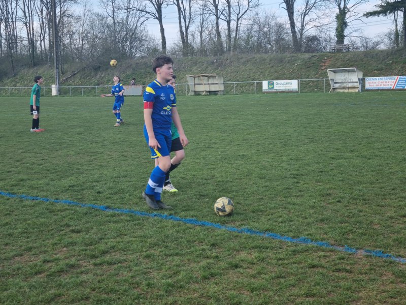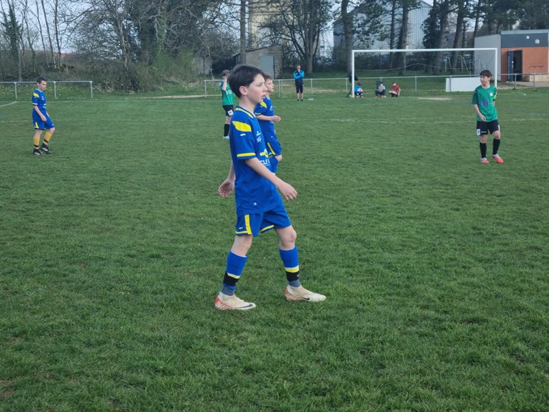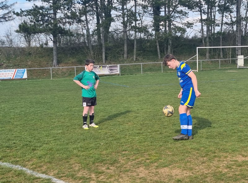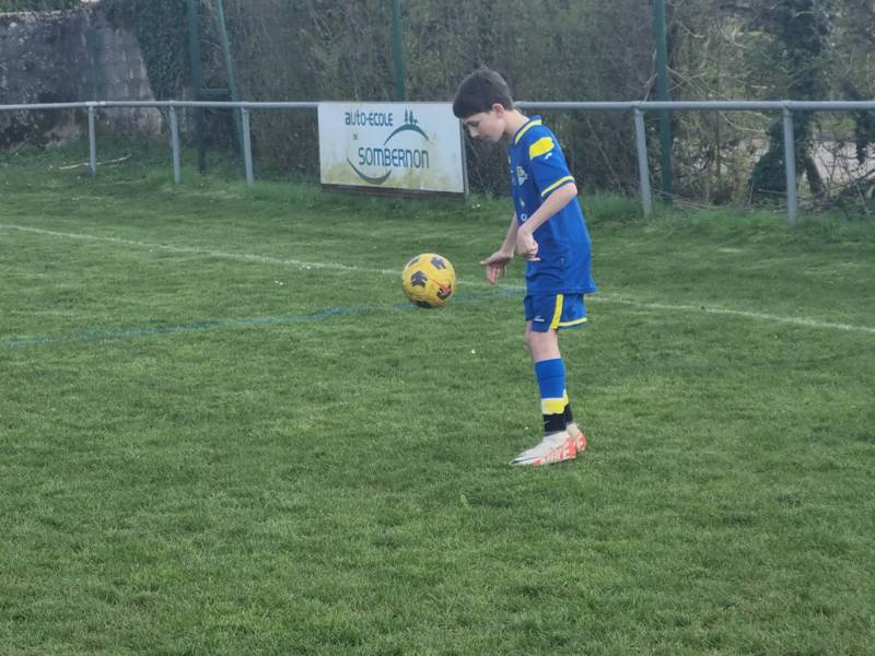 Grosse déception pour nos U13 qui s’inclinent face à Daix. Mis en confiance par leurs deux précédentes victoires, ils n’ont pas réussi la passe de trois. Un manque évident d’agressivité en est la principale cause. Trop souvent battus dans les duels, ils étaient bien trop attentistes pour espérer un bon résultat. Firmin a retardé l’échéance tant qu’il a pu. Le sort du match aurait pu basculer de notre côté, mais il a choisi l’autre camp. Nos bleus se procurent une occasion qu’on qualifie parfois d’ « immanquable » … qu’ils manquent… et sur le contre Daix ouvre le score… On ne peut plus cruel ! Les visiteurs vont même se donner deux buts d’avance, 0-2. En toute fin de rencontre, Erwan en vrai chasseur de but ramène le score à 1-2. On pousse, on pousse….en vain !