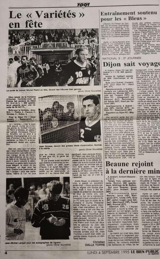 Pour rappel, le Variétés Club de France était venu à Dijon en septembre 95 affronter d’anciens joueurs du Dijon FC à la Fontaine d’Ouche. Platini, Larqué, Giresse, Moutier, Pécout, Rubio, Buigues entre autres étaient de la fête.